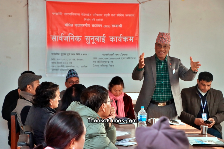 चन्द्रागिरि नगरपालिका वडा नं. ४ थानकोटमा सेटेलाइट परोपकार प्रसुती तथा स्त्रीरोग अस्पताल निर्माण गर्ने कार्यका लागि गरिएको वातावरणीय अध्ययन सम्बन्धी सार्वजनिक सुनुवाई कार्यक्रम सम्पन्न भएको छ ।