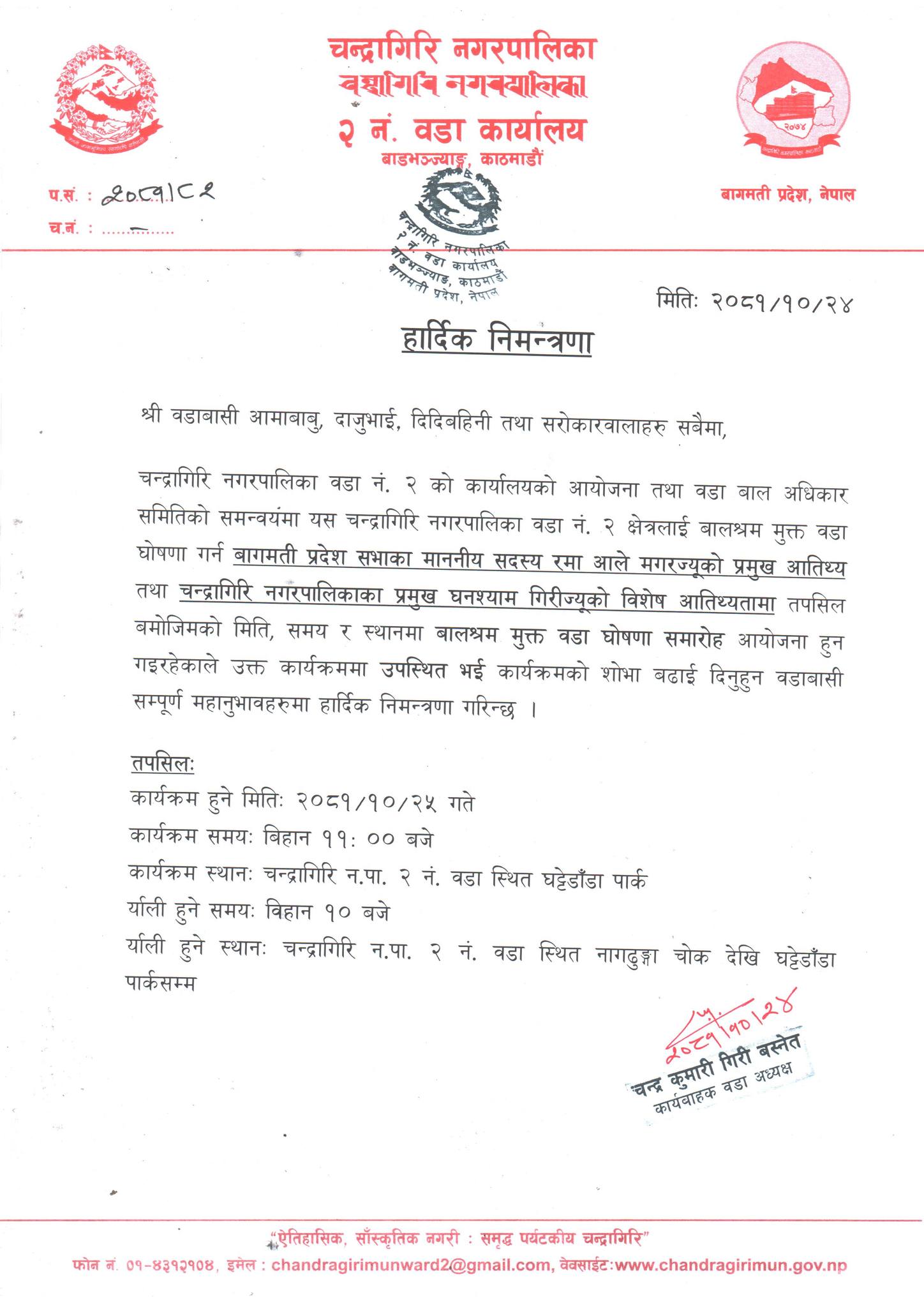 चन्द्रागिरि नगरपालिका वडा नं २ को आयोजना तथा बाल अधिकार समितिको समन्वयमा आज वडा नं २ क्षेत्रलाई बालश्रम मुक्त वडा घोषणा गर्न लागिएको कार्यवाहक वडाध्यक्ष चन्द्रकुमारी गिरी बस्नेतले जानकारी दिइन् ।