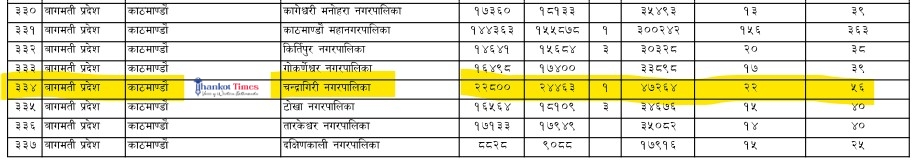 निर्वाचन आयोगले आसन्न स्थानीय निर्वाचनका लागि मतदाताहरूको विवरण सार्वजनिक गरेको छ । जसअनुसार ३० वैशाखको निर्वाचनमा १ करोड ७७ लाख ३३ हजार ७ सय २३ मतदाता छन् । आइतबार आयोगले जारी गरेको विवरण अनुसार चन्द्रागिरि नगरमा कुल मतदाताको संख्या ४७ हजार २ सय ६४ रहेको छ । जुन गत स्थानीय निर्वाचनको तुलनामा ८ हजार ४ सय २८ ले बढी हो ।