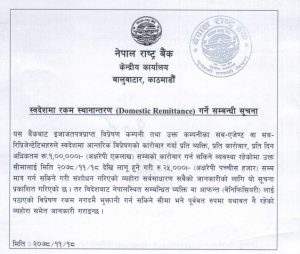 राष्ट्र बैंकले स्वदेशमा रकम स्थानान्तरण गर्नेबारे आफ्नो आधिकारिक वेबसाइटमा बुधबार सूचना जारी गरेको छ।