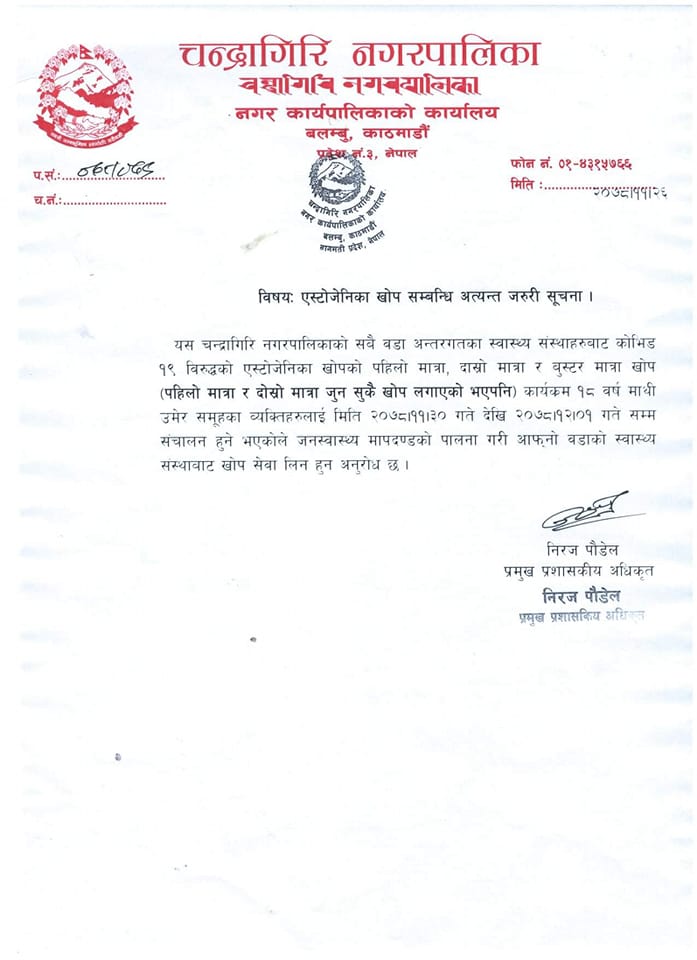 चन्द्रागिरि नगरपालिकाका सबै स्वास्थ्य संस्थामा कोरोना भाइरस विरूद्धको खोप कार्यक्रम सञ्चालन हुने भएको छ । उक्त कार्यक्रम अन्तर्गत फागुन ३० देखि चैत्र १ गतेसम्म चन्द्रागिरि नगरका सबै स्वास्थ्य केन्द्रमा कोरोना भाइरस विरूद्धको खोप लगाइने छ । यसअघि पहिलो र दोश्रो मात्रामा जुनसुकै खोप लगाएको भएपनि दोश्रो तथा बुस्टर डोजमा एस्ट्राजेनिका खोप लगाइने नगरपालिकाबाट जारी सूचनामा उल्लेख गरिएको छ ।
