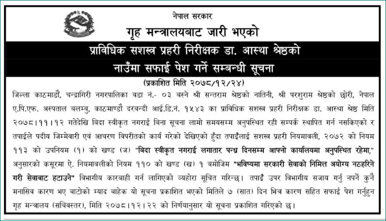 सशस्त्र प्रहरीको बलम्बुस्थित अस्पतालमा कार्यरत सशस्त्र प्रहरी निरीक्षक (इन्स्पेक्टर) डाक्टर आस्था श्रेष्ठ लामो समय कार्यालयमा अनुपस्थित भएपछि गृह मन्त्रालयले सूचना निकालेरै सेवाबाट हटाउने निर्णय गरेको छ । श्रेष्ठ फागुन १२ देखि बिदा स्वीकृत नगराई अस्पतालमा अनुपस्थित भएको सूचना गोरखापत्रमा छापिएको छ।