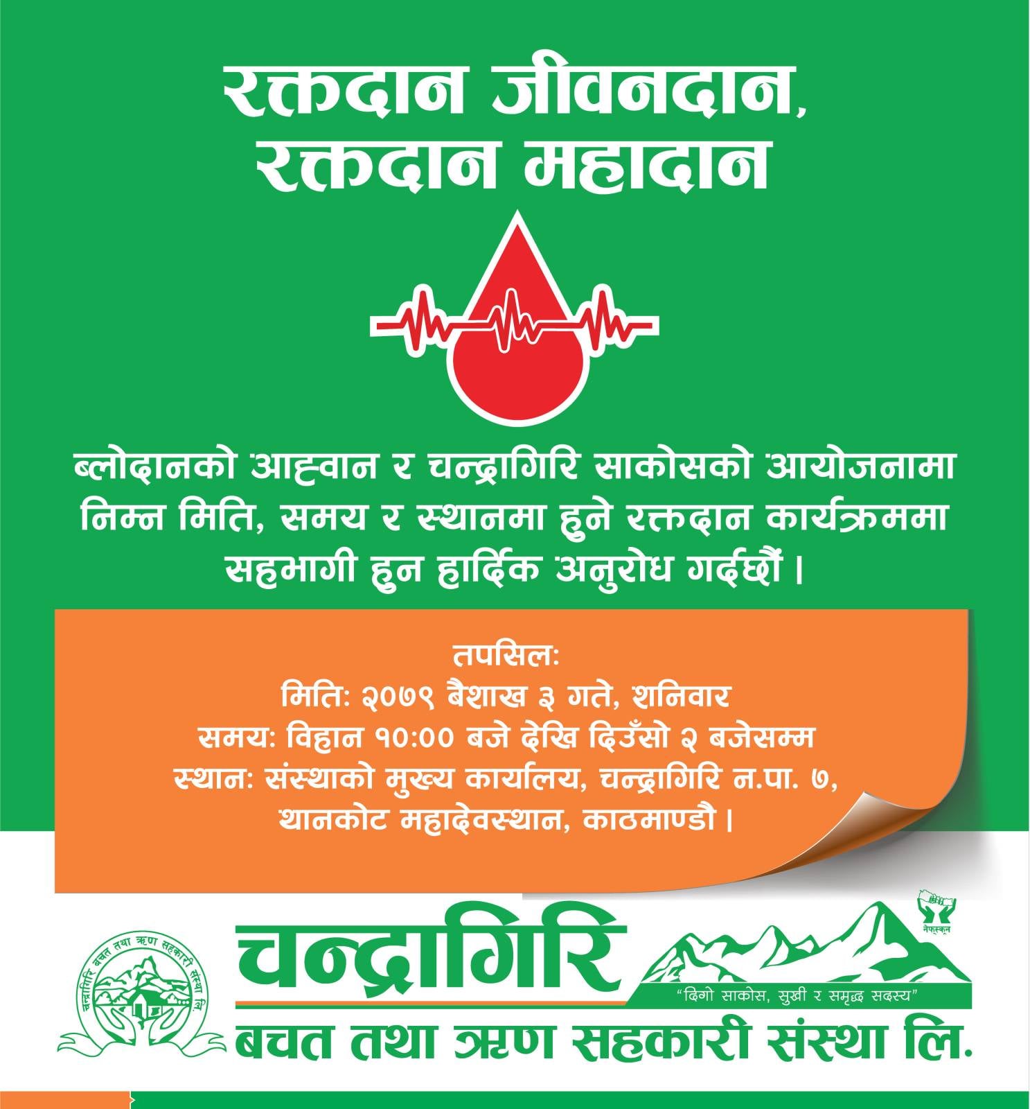 थानकोट चेकपोष्टस्थित चन्द्रागिरि सरकारीले बैशाख ३ गते शनिबार रक्तदान कार्यक्रम आयोजना गर्ने भएको छ । साकोस स्थापनाको २१औं वार्षिकोत्सवको अवसरमा संस्थाको प्राङ्गणमा सो कार्यक्रम हुने बताइएको छ ।