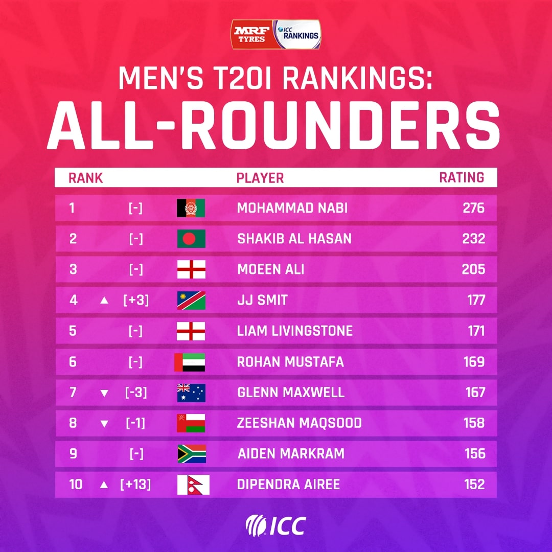 वरियताको पहिलो नम्बरमा अफगानिस्तानका मोहम्मद नाबी रहेका छन्। यस्तै बंगलादेशका साकिब अल हसन दोस्रो र इंग्ल्याण्डका मोइन अली तेस्रो स्थानमा छन्।