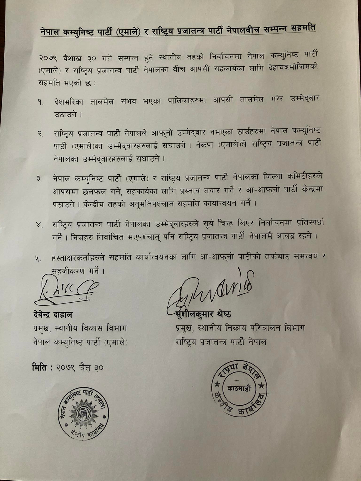 आसन्न स्थानीय निर्वाचनमा प्रमुख प्रतिपक्षी दल नेकपा एमाले र केहि साताअघि गठन भएको राप्रपा नेपालसँग तालमेल गर्ने निर्णय गरेको छ । बुधबार नेकपा एमालेका स्थानीय विकास विभागमा प्रमुख देवेन्द्र दाहाल तथा राप्रपा नेपालका स्थानीय निकाय परिचालन विभाग प्रमुख सुशीलकुमार श्रेष्ठले सहमति पत्रमा हस्ताक्षर गरेका छन् । अब स्थानीय चुनावमा राप्रपा नेपालका उम्मेदवारहरूले सूर्य चिन्हबाट मत माग्नेछन् ।