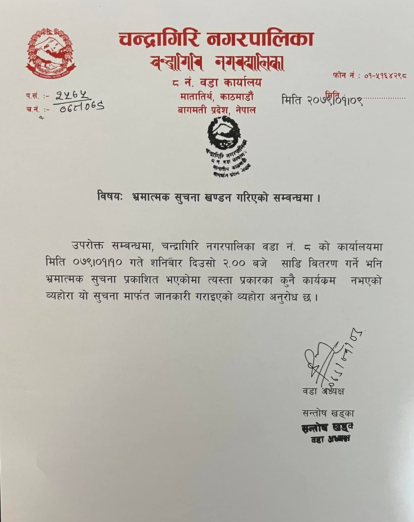 चन्द्रागिरि नगरपालिका वडा नंं ८ का वडाध्यक्ष सन्तोष खड्काले उक्त सूचना भ्रमात्मक भएको भन्दै खण्डन गर्दै सूचना जारी गरेका छन् ।