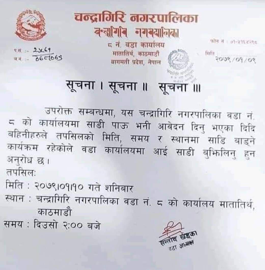 वडा ८ को कार्यालयमा साडी पाउँ भनी आवेदन दिएकोमा सो अनुसार वैशाख १० गते शनिबार वडा कार्यालयमा साडी बाँडिने भएकोले वडा कार्यालयमा उपस्थित भई साडी लिन सकिने उक्त सूचना उल्लेख छ ।