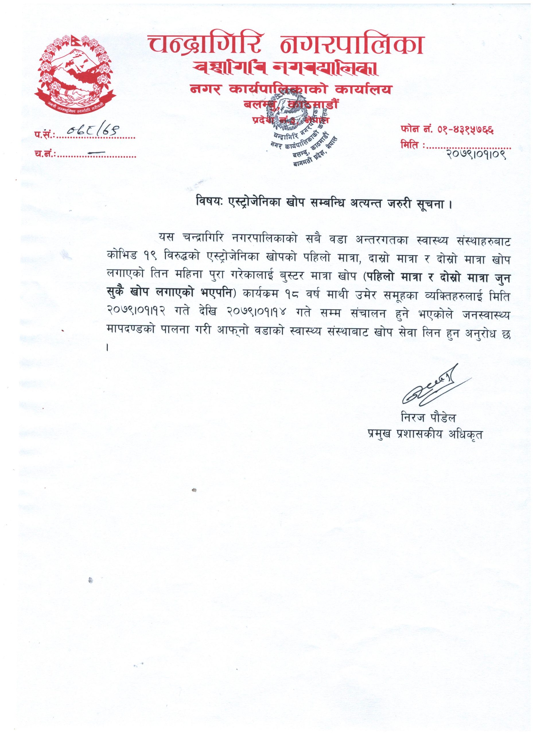 सोमबारबाट चन्द्रागिरि नगरमा कोरोना भाइरस विरूद्धको खोप लगाइने भएको छ । नगर क्षेत्रका सबै स्वास्थ्य संस्थाहरूबाट एस्ट्रोजेनिका खोपको दोश्रो तथा तेश्रो मात्रा (बुस्टर डोज) लगाइने नगरपालिकाबाट जारी सूचनामा उल्लेख छ । पहिलो मात्रामा तथा दोश्रो मात्रामा जुनसुकै कम्पनीको खोप लगाएको भएपनि बुस्टर डोजमा एस्ट्रोजेनिका खोप दिइने सूचनामा भनिएको छ ।