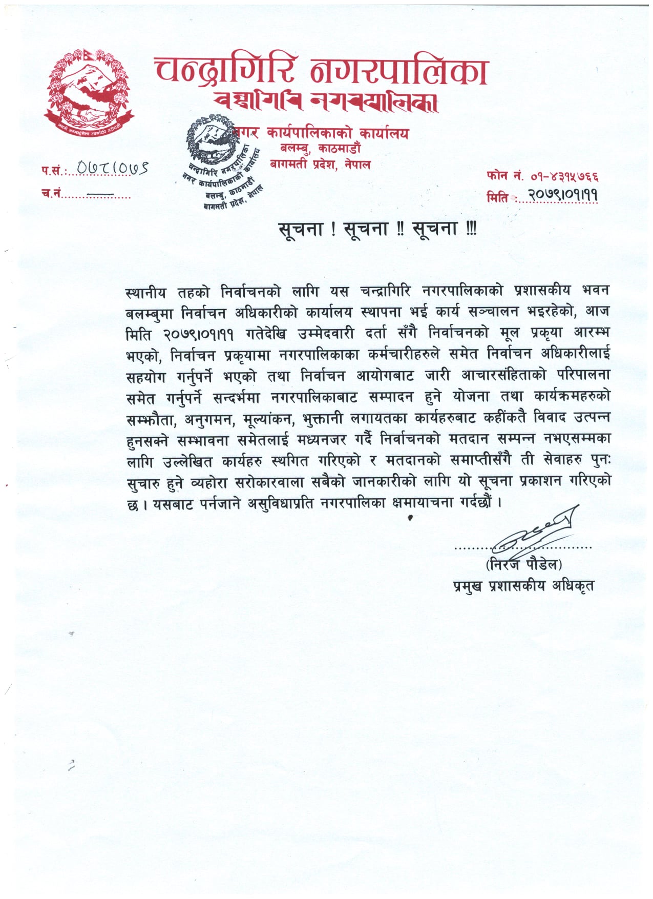चन्द्रागिरि नगरपालिकाको कार्यालयबाट सम्पादन हुने केही कार्यहरू स्थानीय तह निर्वाचन सम्पन्न नहुँदासम्म केही सेवाहरू स्थगित गरिने भएको छ ।