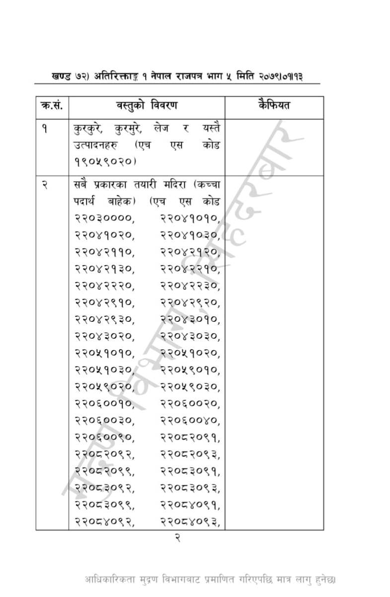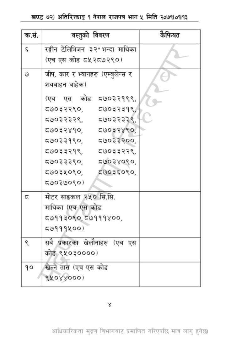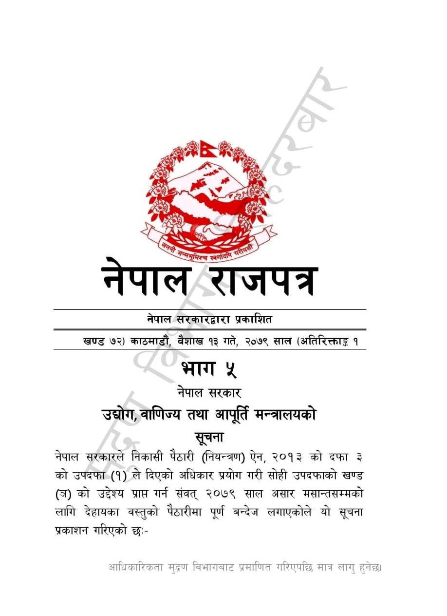 सरकारले असार मसान्तसम्म १० प्रकारका सामानहरू नेपाल भित्र्याउन प्रतिबन्ध लगाएको छ । उद्योग वाणिज्य तथा आपूर्ति मन्त्रालयले नेपाल राजपत्र सूचनामा प्रकाशित गर्दै विभिन्न १० प्रकारका सामानहरु नेपाल भित्र्याउने रोक लगाएको हाे। विवरण अनुसार विलासी उपभोग्य सामान नेपाल भित्र्याउने रोक लगाइएको छ। आयातमा रोक लगाइएका सामान निम्नानुसार छन्ः