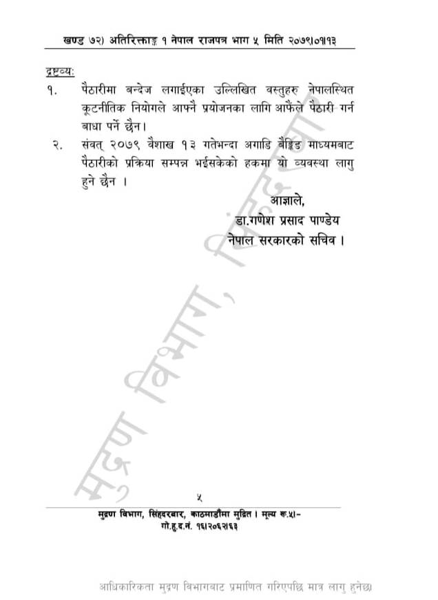 उद्योग वाणिज्य तथा आपूर्ति मन्त्रालयले कूटनीतिक नियोगका अधिकारीहरुलाई भने यी सामान ल्याउन बन्देज लागू नहुने जनाएको छ। यसैगरी वैशाख १३ गतेअघि बैंकिङ प्रक्रिया पूरा गरेकाहरुको हकमा पनि बन्देज लागू हुने छैन्।