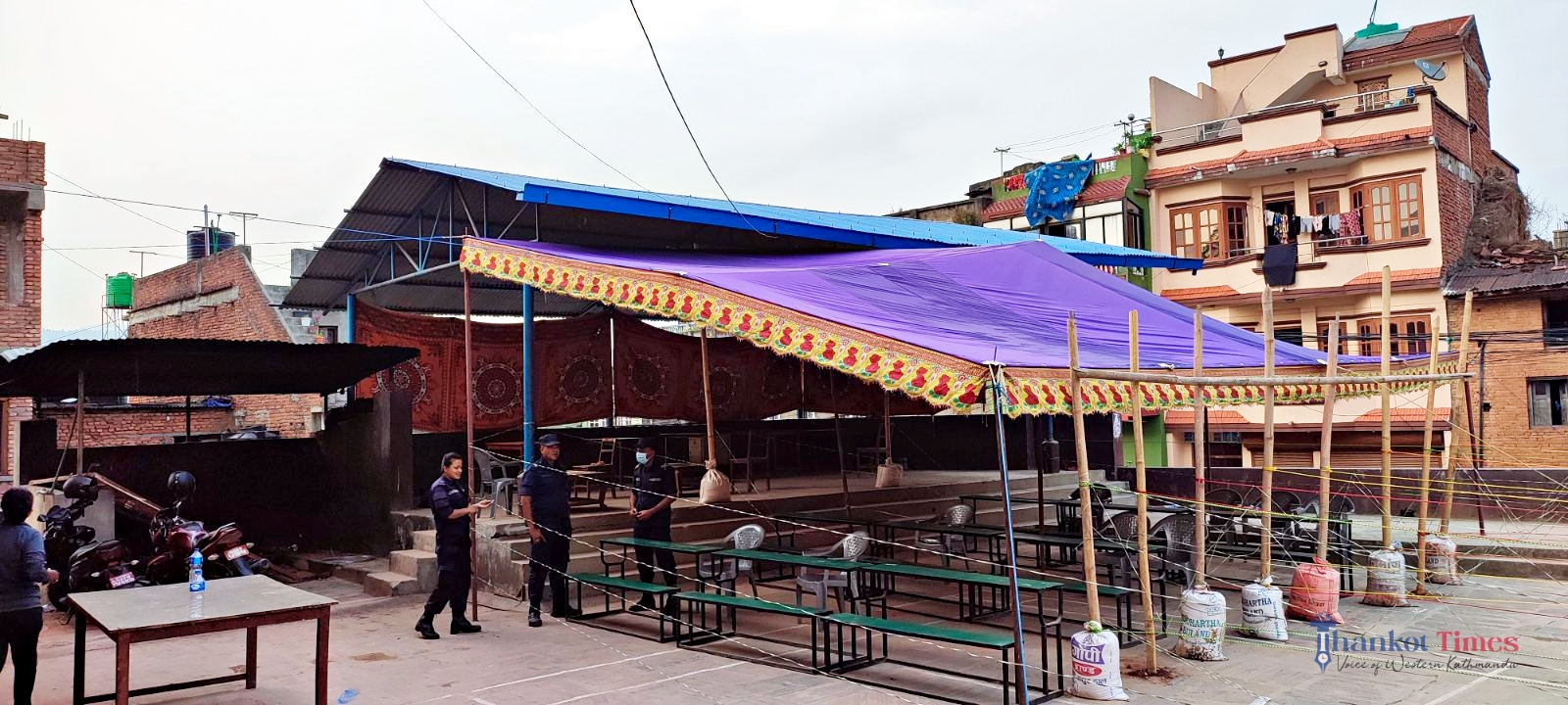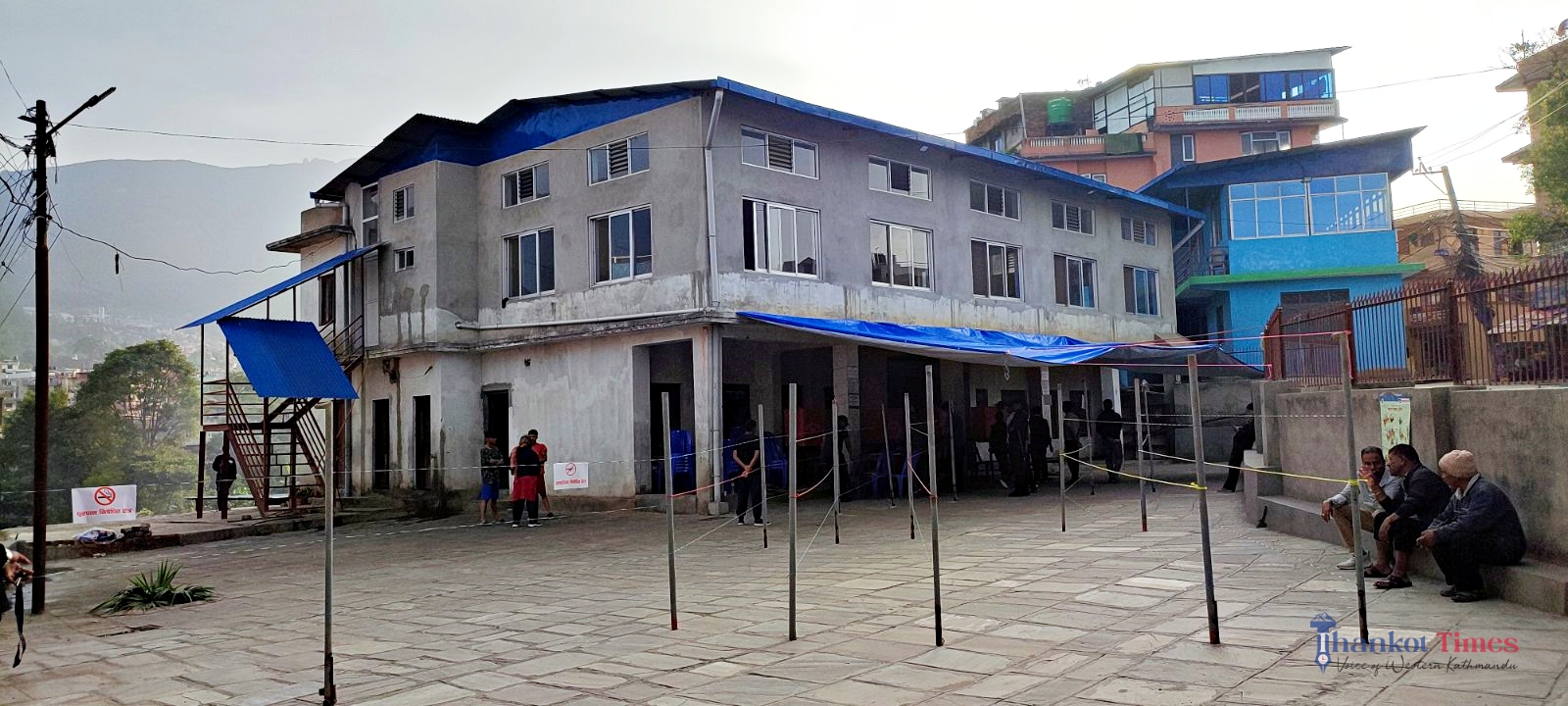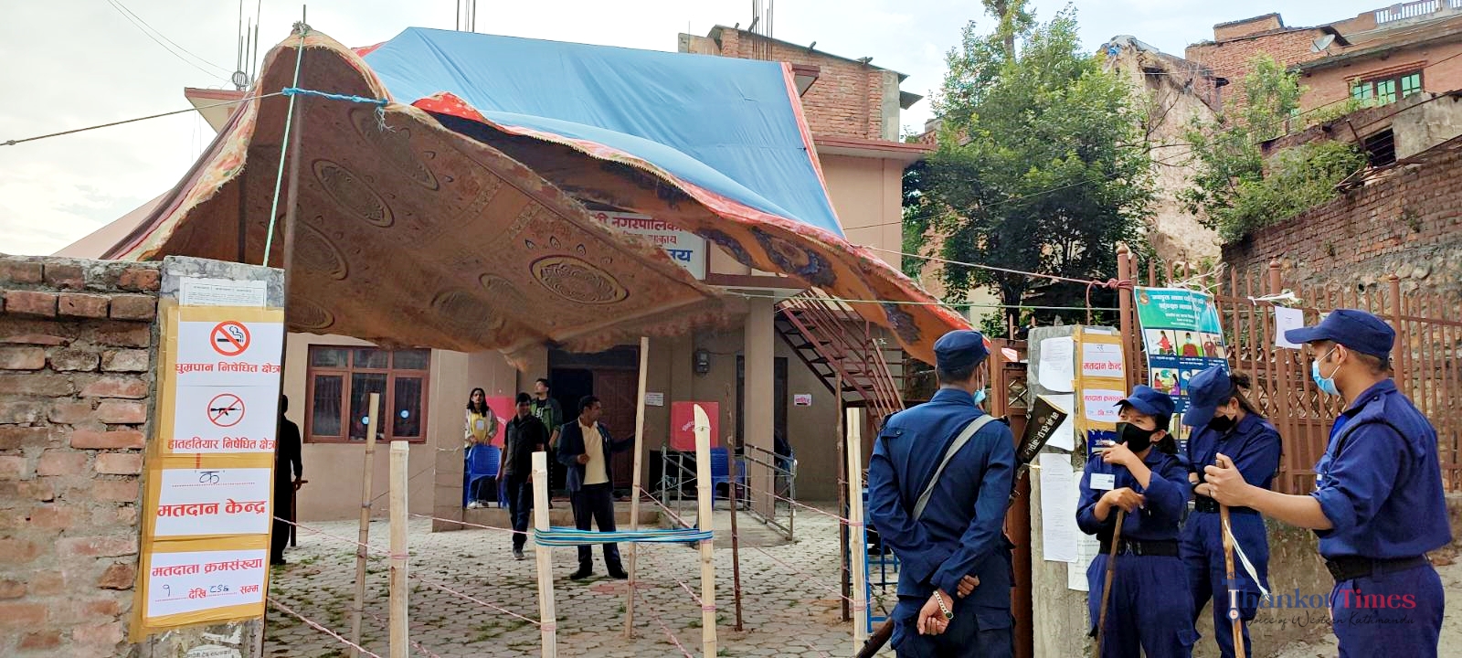 मतदानका दिन पानी पर्न सक्ने सम्भावना देखिएपछि नगरका अधिकांश मतदान स्थलमा त्रिपाल हालिएको छ ।