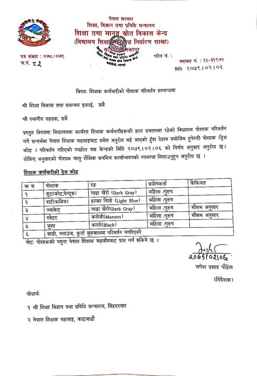 शिक्षा तथा मानव स्रोत विकास केन्द्रले सामुदायिक विद्यालयमा कार्यरत शिक्षक कर्मचारीहरूको विद्यालय पोशाक परिवर्तन गरेको छ । केन्द्रले एक सूचना जारी गर्दै विद्यालयमा कार्यरत शिक्षक कर्मचारीहरुको विद्यालय पोशाक परिवर्तन गरेको हाे ।