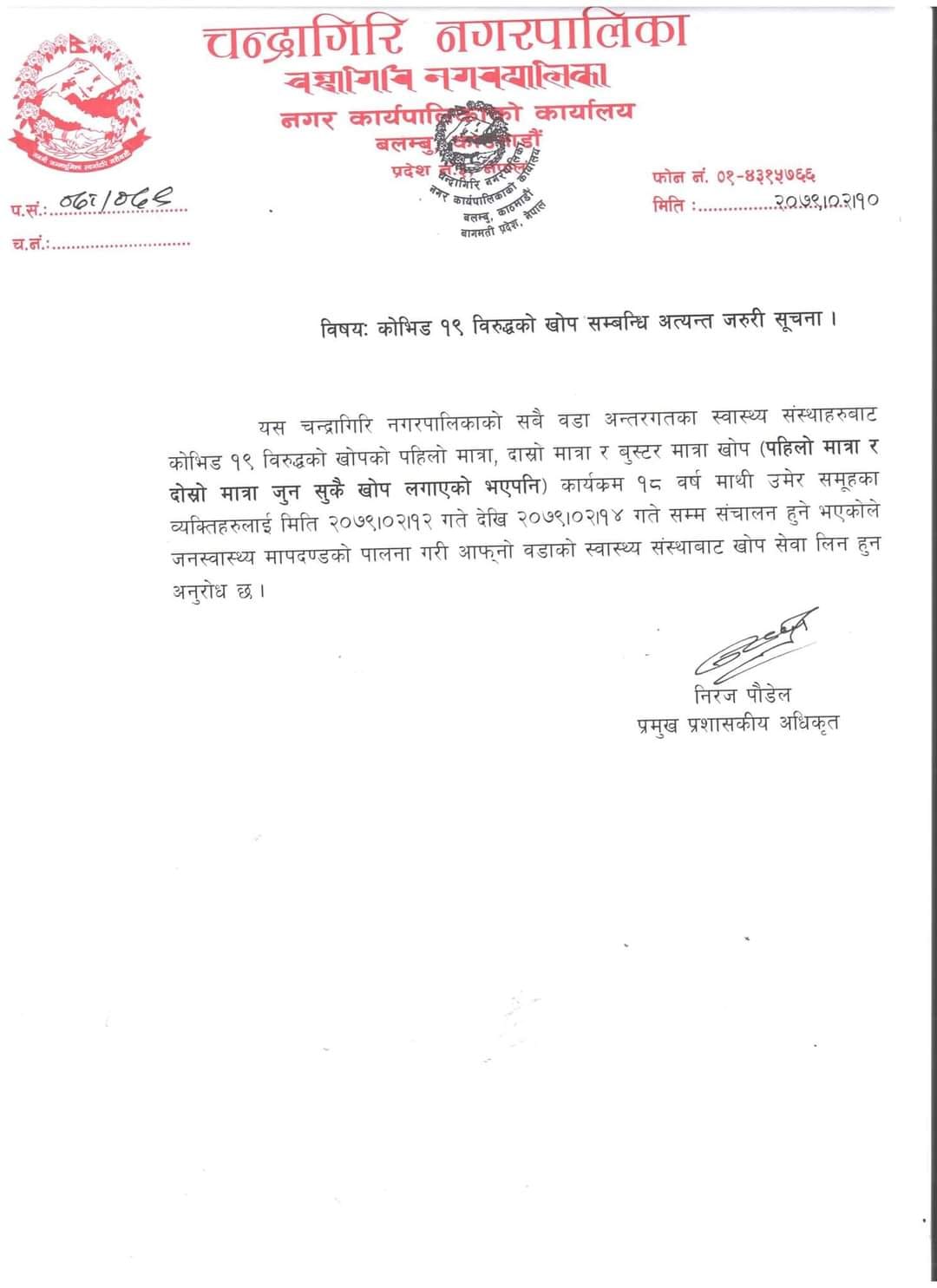 सोमबारबाट चन्द्रागिरि नगरमा कोरोना भाइरस विरूद्धको खोप लगाइने भएको छ । नगर क्षेत्रका सबै स्वास्थ्य संस्थाहरूबाट एस्ट्रोजेनिका खोपको दोश्रो तथा तेश्रो मात्रा (बुस्टर डोज) लगाइने नगरपालिकाबाट जारी सूचनामा उल्लेख छ । पहिलो मात्रामा तथा दोश्रो मात्रामा जुनसुकै कम्पनीको खोप लगाएको भएपनि बुस्टर डोजमा एस्ट्रोजेनिका खोप दिइने सूचनामा भनिएको छ ।