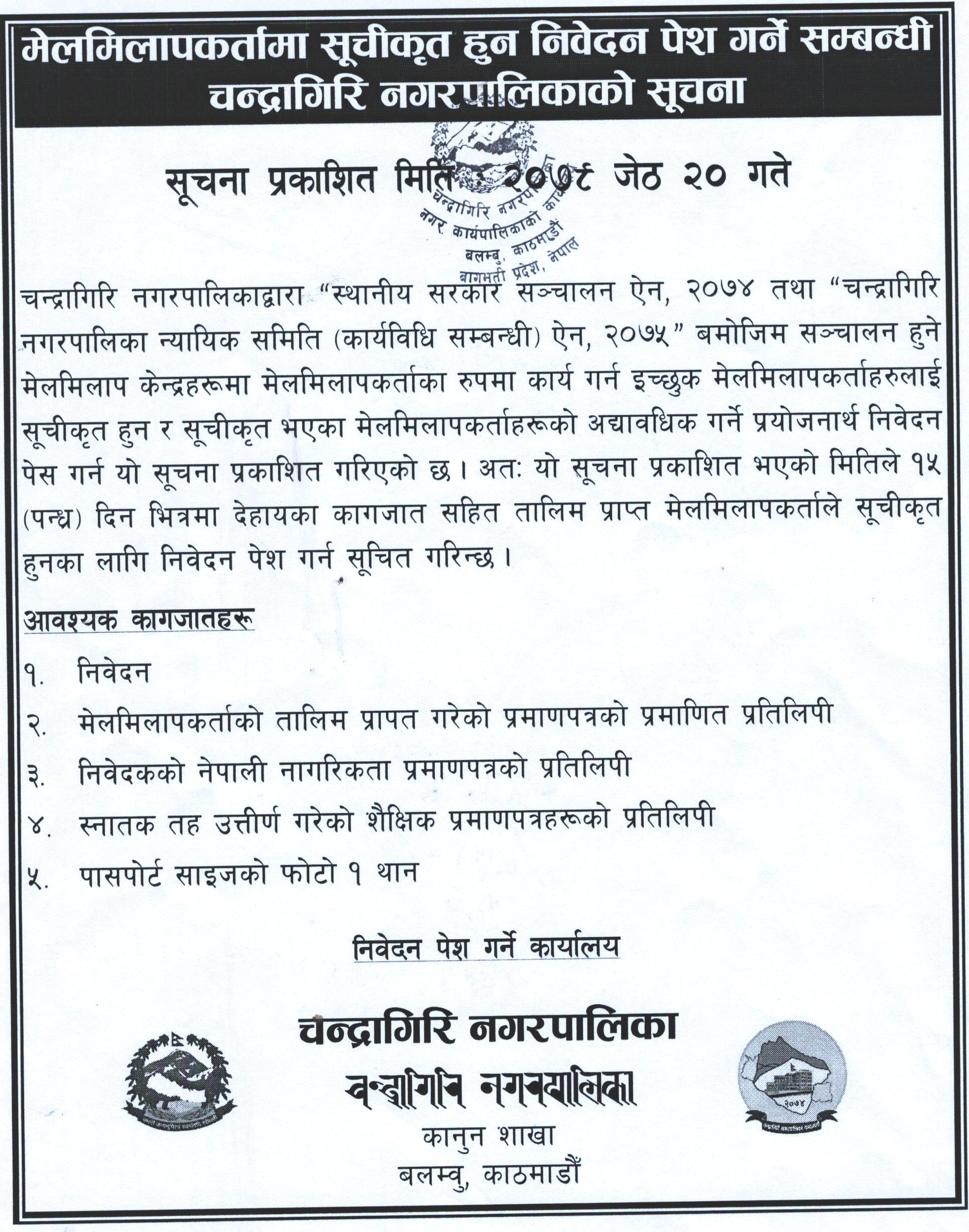 चन्द्रागिरि नगरपालिकाले मेलमिलाप केन्द्रहरूमा रहि मेलमिलाप कार्यमा संलग्न हुन चाहनेहरूका लागि सूचीकृत हुन आह्वान गरेको छ । चन्द्रागिरि नगरपालिकाको न्यायिक समितिमा रहि कार्य गर्न इच्छुक व्यक्तिले सूचीकृत हुन असार ३ गतेभित्र नगरपालिकाको कार्यालयमा निवेदन पेश गर्न सक्नेछन् । स्नातक तह उत्तीर्ण गरेका नेपाली नागरिकहरूले  नगरको मेलमिलापकर्ताका रूपमा सूचीकृत हुन सक्नेछन् ।