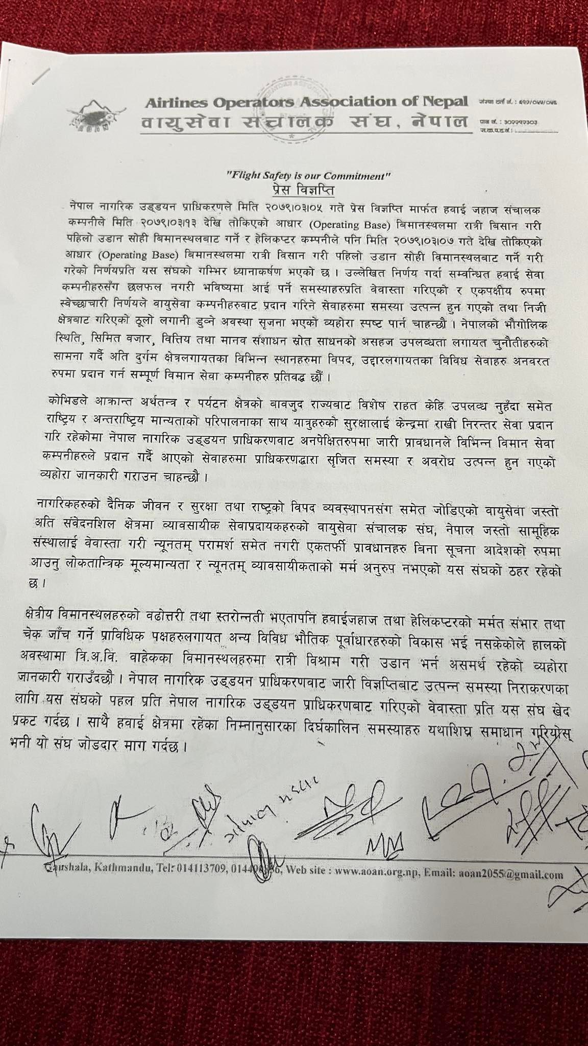 वायुसेवा सञ्चालक संघले भोलिदेखि आन्तरिक तथा बाह्य सबै उडान बन्द गर्ने निर्णय गरेको छ ।