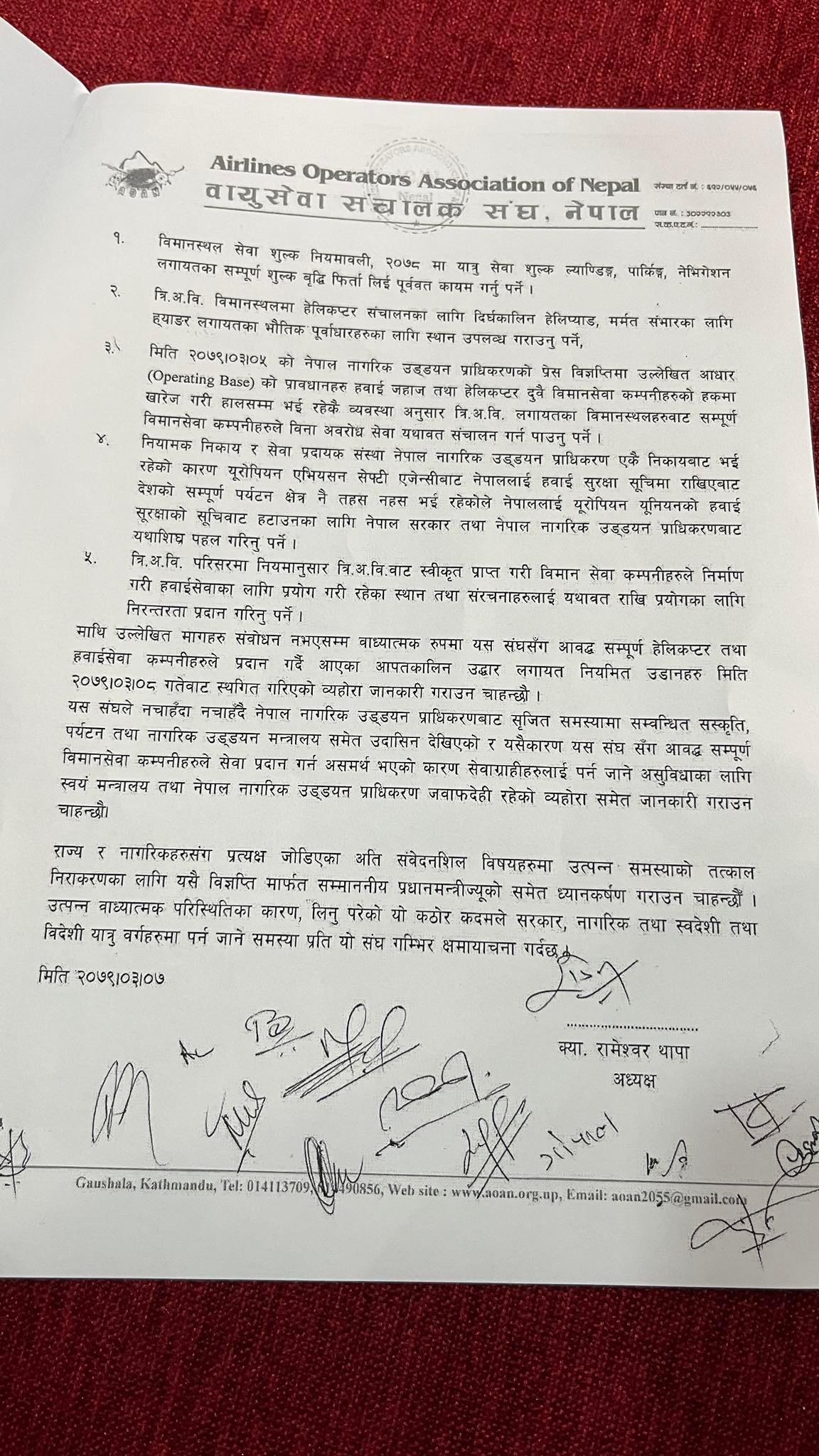पर्यटनमन्त्री प्रेम आलेले निजी क्षेत्रविरुद्ध पूर्वाग्रही साँध्दै अव्यवहारिक निर्णय गरेको विरोधमा उडानहरू बन्द गर्ने निर्णय गरिएको संघले जनाएको छ ।
