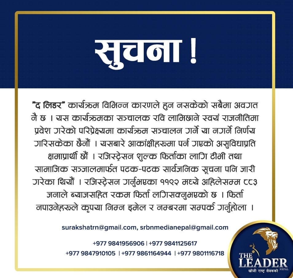 ‘द लिडर’ ले भन्यो – ब्याजसहित पैसा फिर्ता गर्छौँ