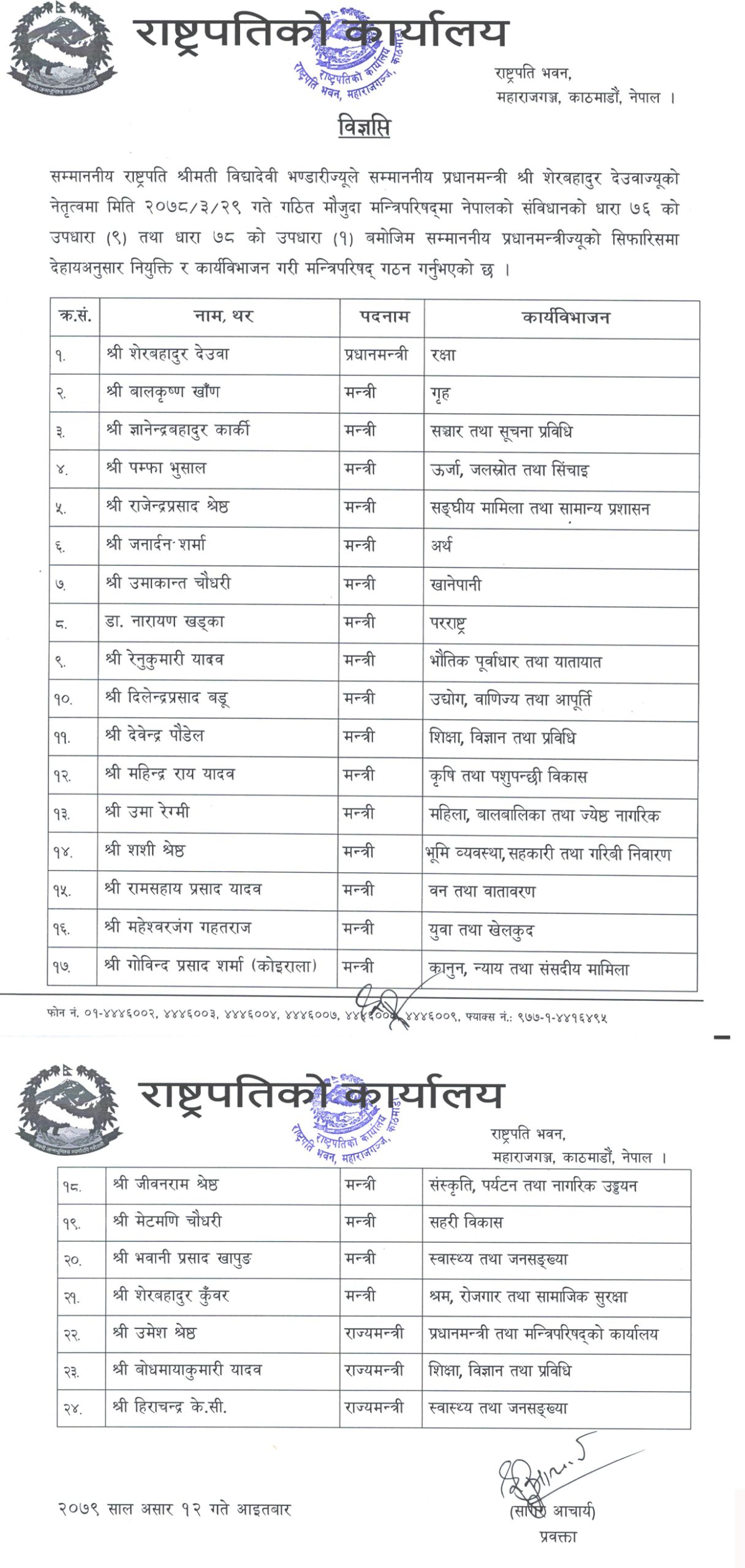 आइतबार प्रधानमन्त्री शेरबहादुर देउवाले नेकपा एकीकृत समाजवादीबाट नियुक्त भएका मन्त्रीको हेरफेर गरेका थिए ।
