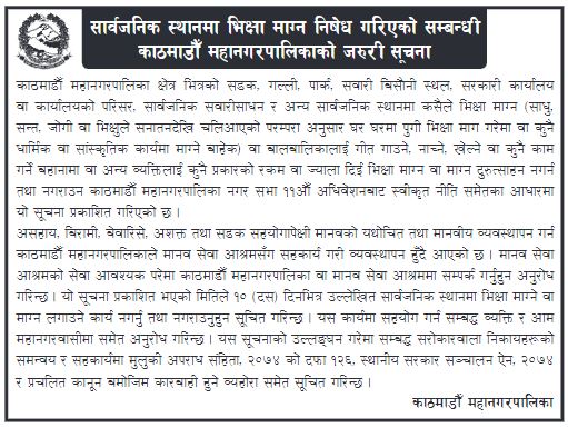 काठमाडौं महानगरभित्रका क्षेत्रमा भिक्षा माग्न निषेध गरिएको छ । काठमाडौं महानगरपालिकाले एक सूचना निकालेर महानगर क्षेत्रभित्रका सडक, गल्ली, पार्क, बस बिसौनी, सरकारी कार्यालय परिसर, सार्वजनिक गाडी र अन्य सार्वजनिक ठाउँमा भीक माग्न निषेध गरेको हो ।