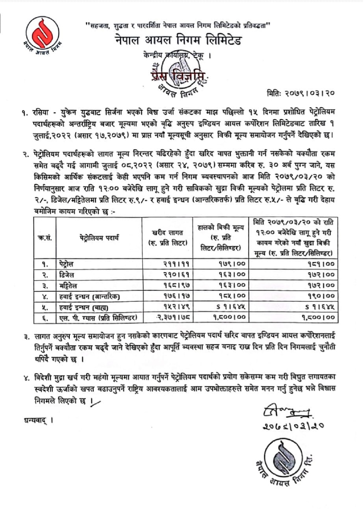 निगमद्वारा जारी विज्ञप्तिअनुसार नयाँ मूल्यसँगै अब काठमाडौं उपत्यकामा पेट्रोल १८१ रूपैयाँ, डिजेल र मट्टीतेल १७२ रूपैयाँ लिटर पर्नेछ।