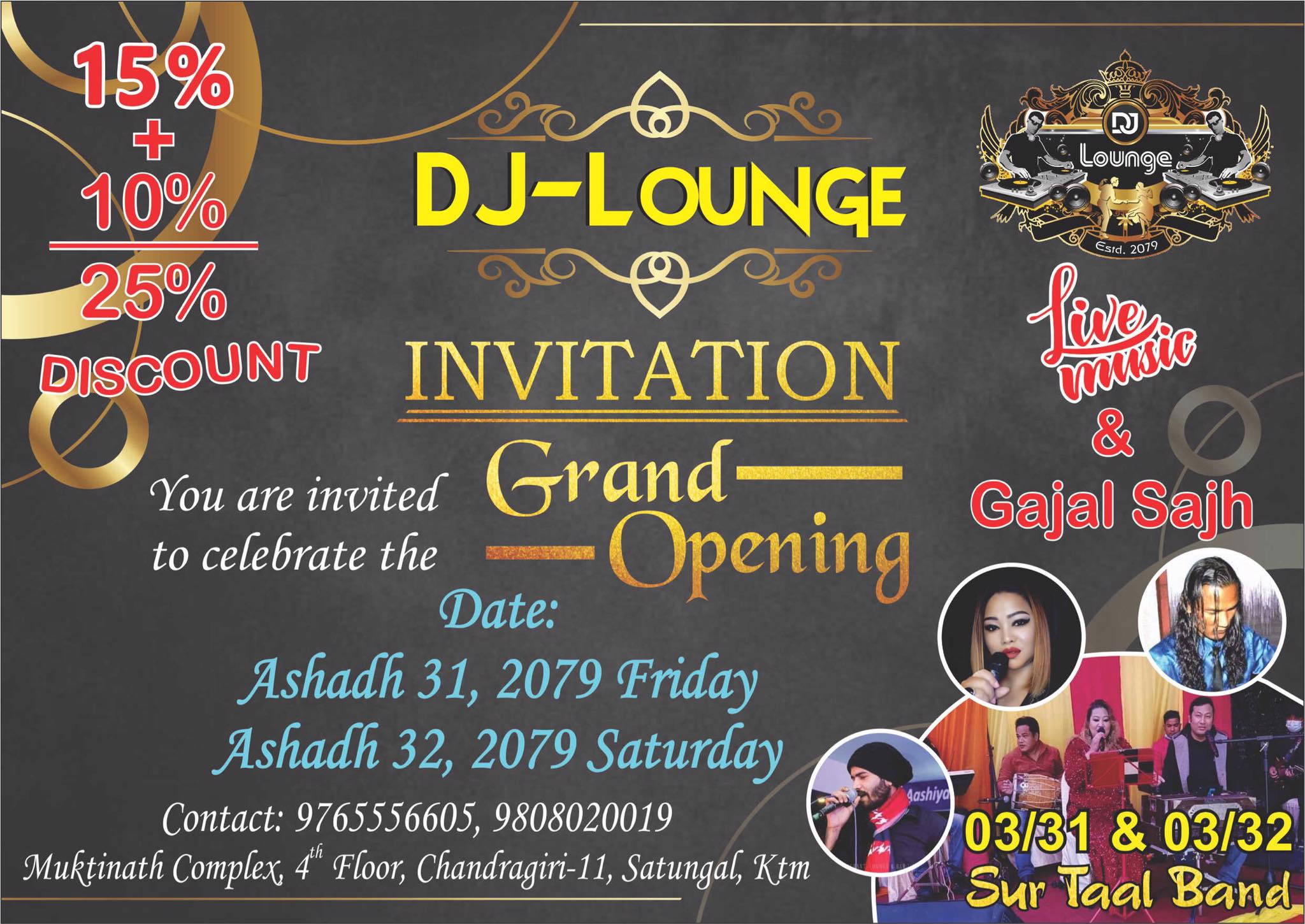 गत महिनाबाट सञ्चालनमा आएको डिजे लाउन्जको आगामी शुक्रबार औपचारिक उद्घाटन गरिने भएको छ । सञ्चालक देवकुमार महर्जनका अनुसार उद्घाटन कार्यक्रममा सुरताल सांगितिक समुह, गायक सुभाष मण्डल, ममता राई लगायतका ख्याती प्राप्त कलाकारहरूले ‘लाइभ’ प्रस्तुति दिनेछन् ।