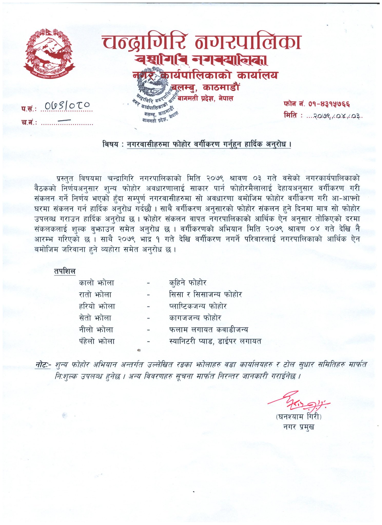 सो सूचनामा वर्गीकरण अनुसारको फोहोर संकलन हुने दिनमा मात्र सो फोहोर संकलकलाई दिन भनिएको छ भने फोहोर वर्गीकरण नगर्ने परिवारलाई नगरपालिकाले भदाै १ गतेबाट जरिवाना तिराउने समेत जनाइएको छ । चन्द्रागिरि नगरपालिकाको वातावरण तथा विपद् व्यवस्थापन शाखाका अनुसार हाल चन्द्रागिरि नगरमा विभिन्न ६ वटा संस्थाले फोहोर संकलन गर्दै आएका छन् ।