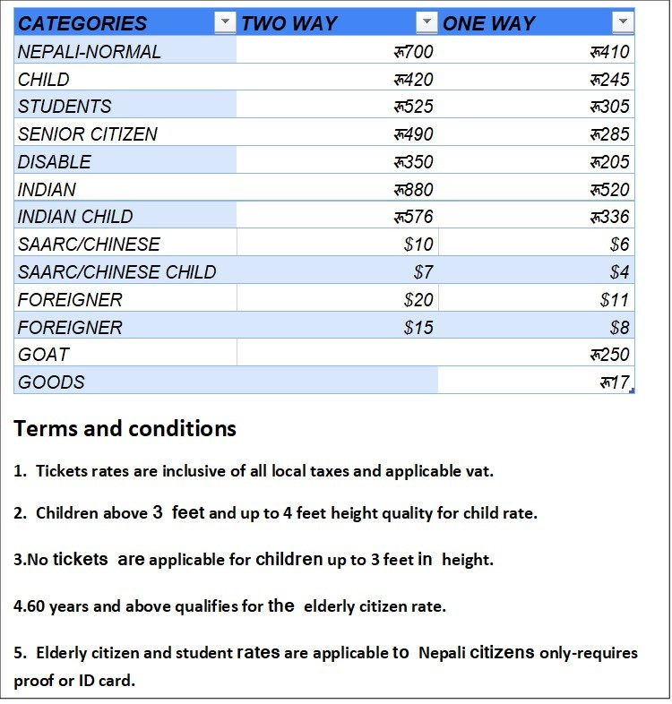 यसअघि नेपालीहरु यात्रुहरूका केबलकार यात्राका लागि दुईतर्फी टिकटमा ६७५ रूपैयाँ भाडा कायम भएकोमा अब ७०० रूपैयाँ तिर्नुपर्नेछ ।