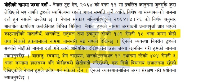 त्यसरी नै महालेखाले बालाजु, स्वयम्भू, शेष नारायण, थानकोटलगायतका ११ स्थानमा रहेको ४०४ रोपनी जग्गा हालसम्म पनि मोहीले नै खेती गरिरहेको, एक निजी विद्यालय सञ्चालनमा रहेकोले उक्त जग्गा समेत नेपाल ट्रष्टको नाममा ल्याउनु पर्ने महालेखाको ५९ औं प्रतिवेदनमा उल्लेख गरिएको छ ।