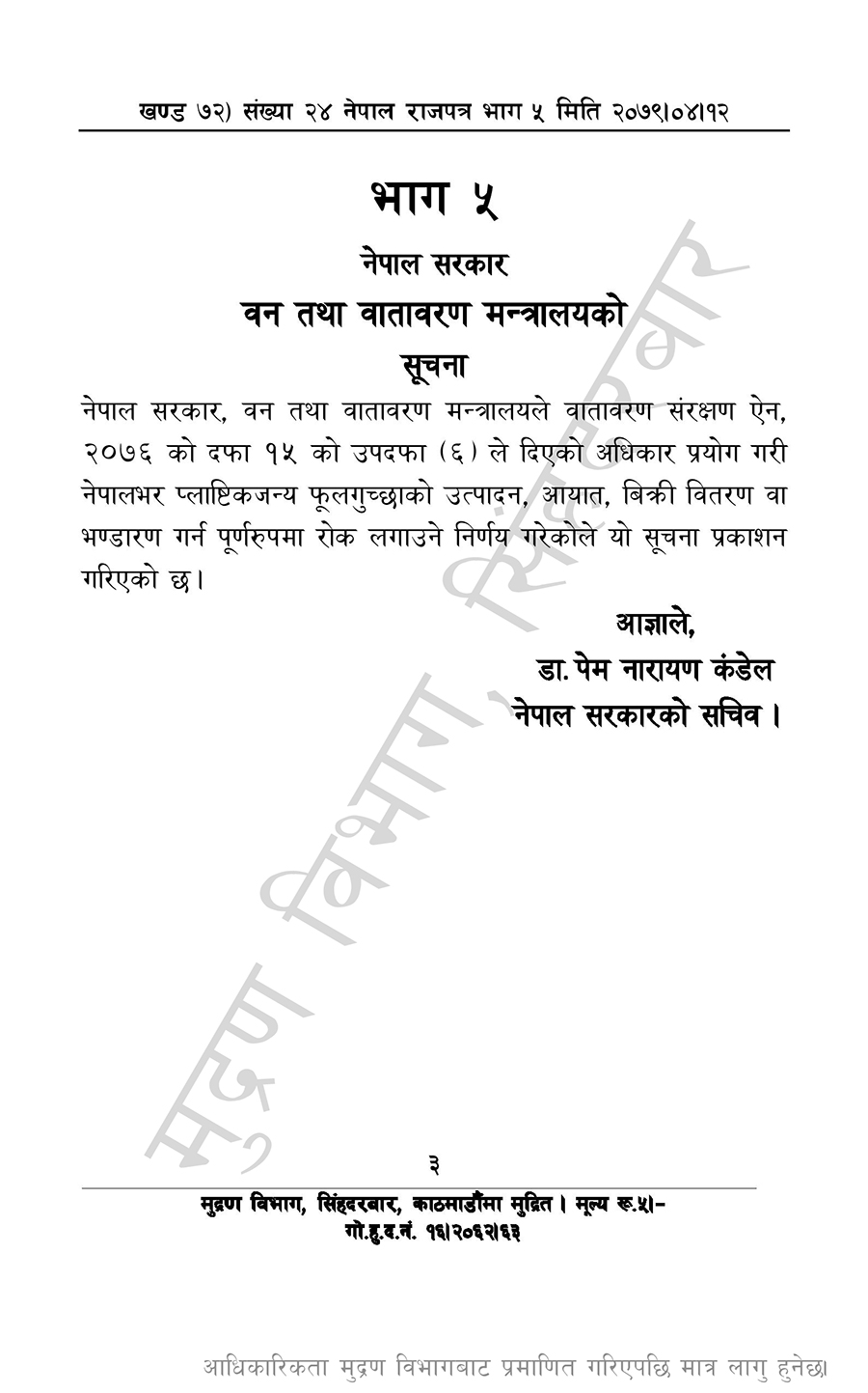 मन्त्रालयले वातावरण संरक्षण ऐन २०७६ को दफा १५ को उपदफा ६ ले दिएको अधिकार प्रयोग गरी यस्तो निर्णय गरेको जनाएको छ ।