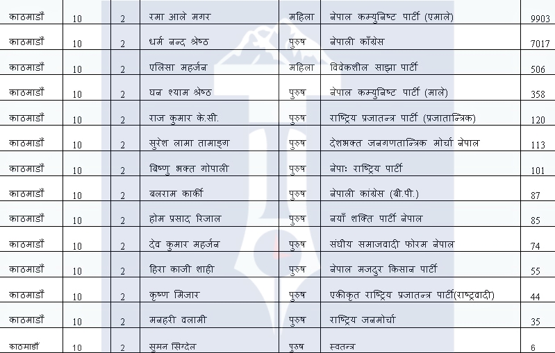 २०७४ को प्रदेश सभा सदस्य निर्वाचन : काठमाण्डाै क्षेत्र नं. १० ‘ख’ को अन्तिम मत परिणाम यस्तो थियो