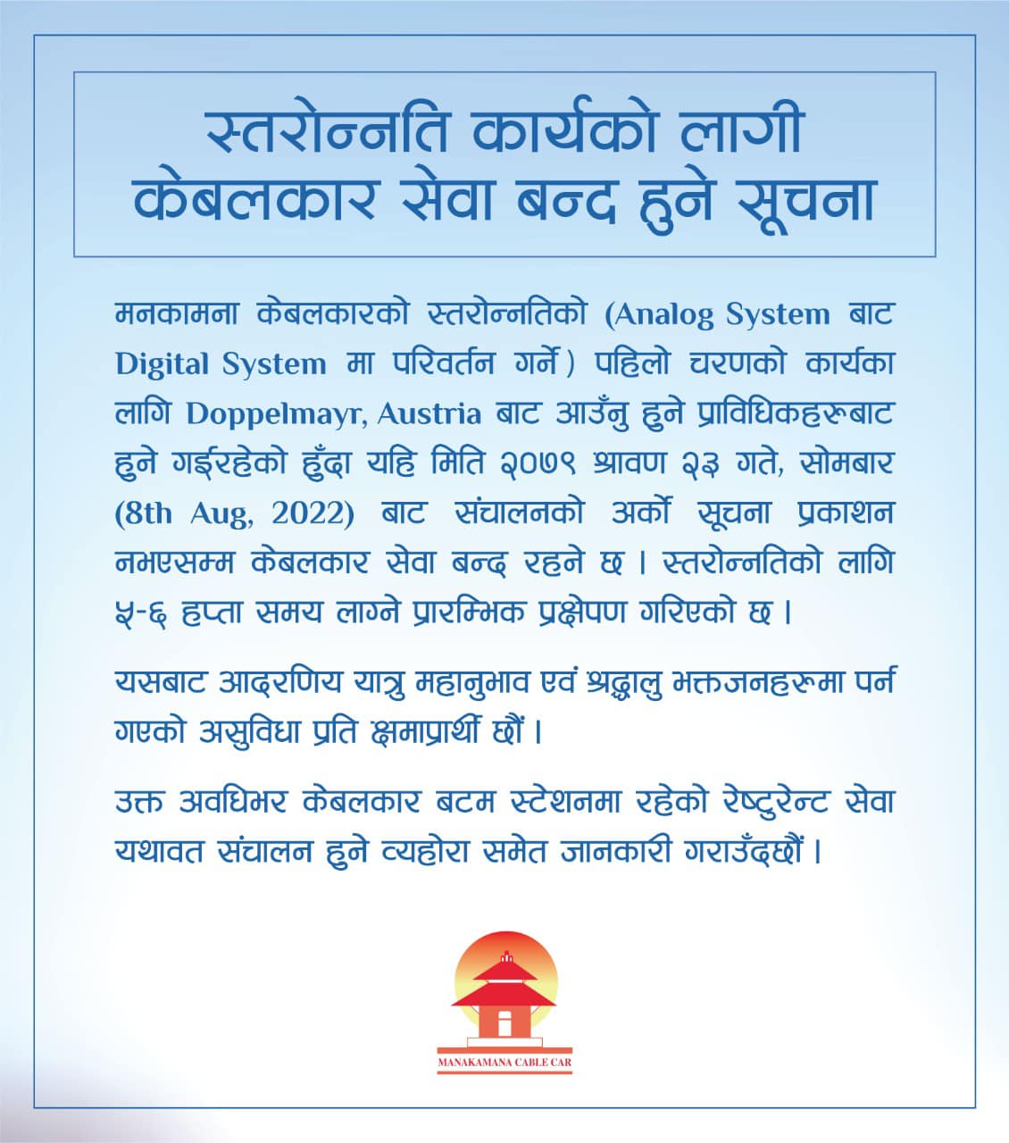 केबलकारको स्तरोन्नतिको पहिलो चरणको कार्यका लागि श्रावण २३ गतेबाट अर्को सूचना प्रकाशित नभएसममका लागि केबलकार सेवा बन्द गर्न लागिएको मनकामना केबलकारले जनाएको छ ।
