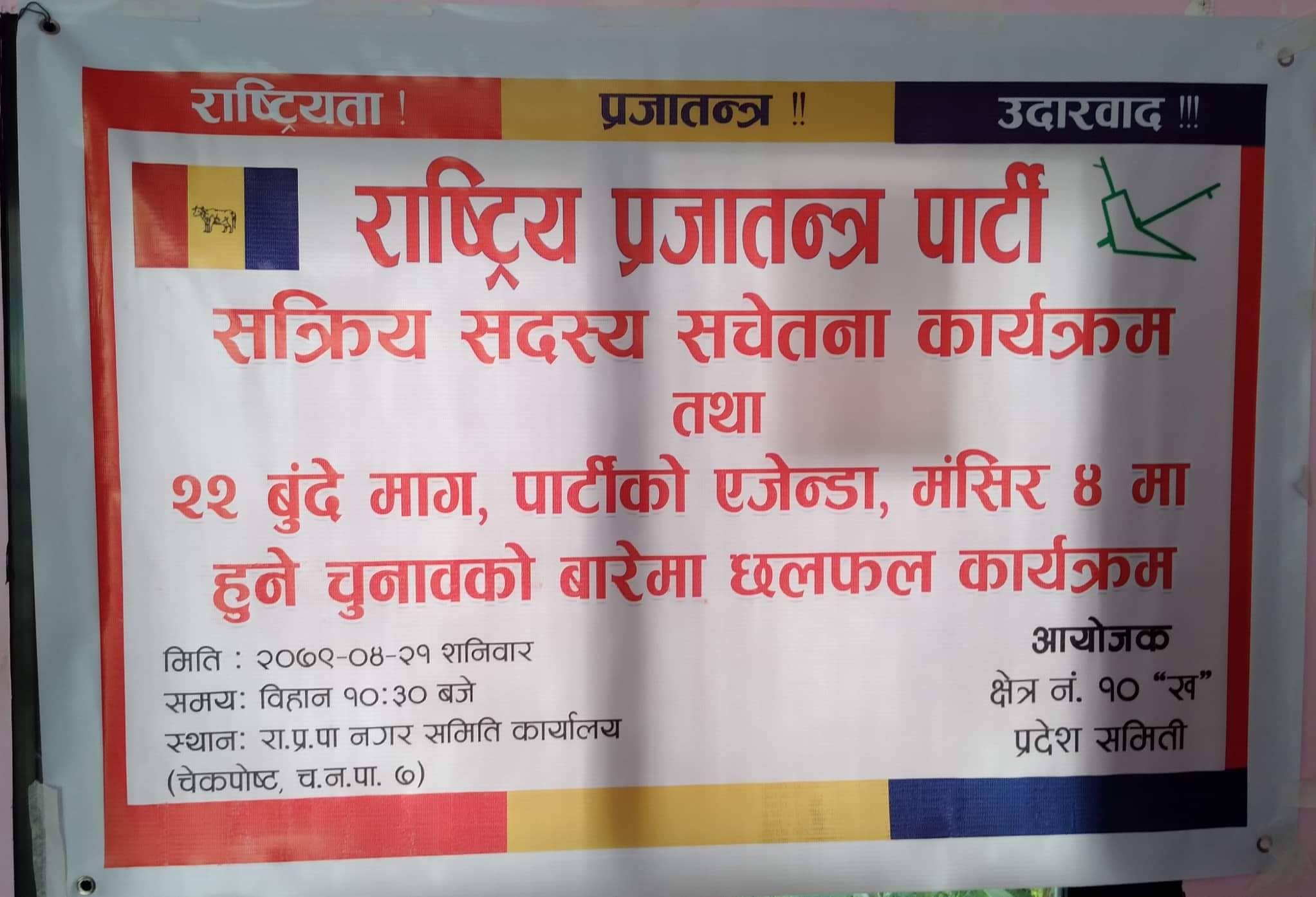 यस्तै राष्ट्रिय प्रजातन्त्र पार्टीको चन्द्रागिरि नगर कमिटिको कार्यालयमा सो पार्टीको काठमाण्डाै क्षेत्र नं. १० ख का क्षेत्रीय नेता तथा स्थानीय नेताहरूको उपस्थितिमा सक्रिय सदस्य सचेतना कार्यक्रम आयोजना गरिएको राप्रपा स्रोतले जानकारी दियो । कार्यक्रमका दाैरान सो पार्टीको २२ बुँदे माग, पार्टीको एजेण्डा लगायतका बारेमा छलफल भएको बताइएको छ ।