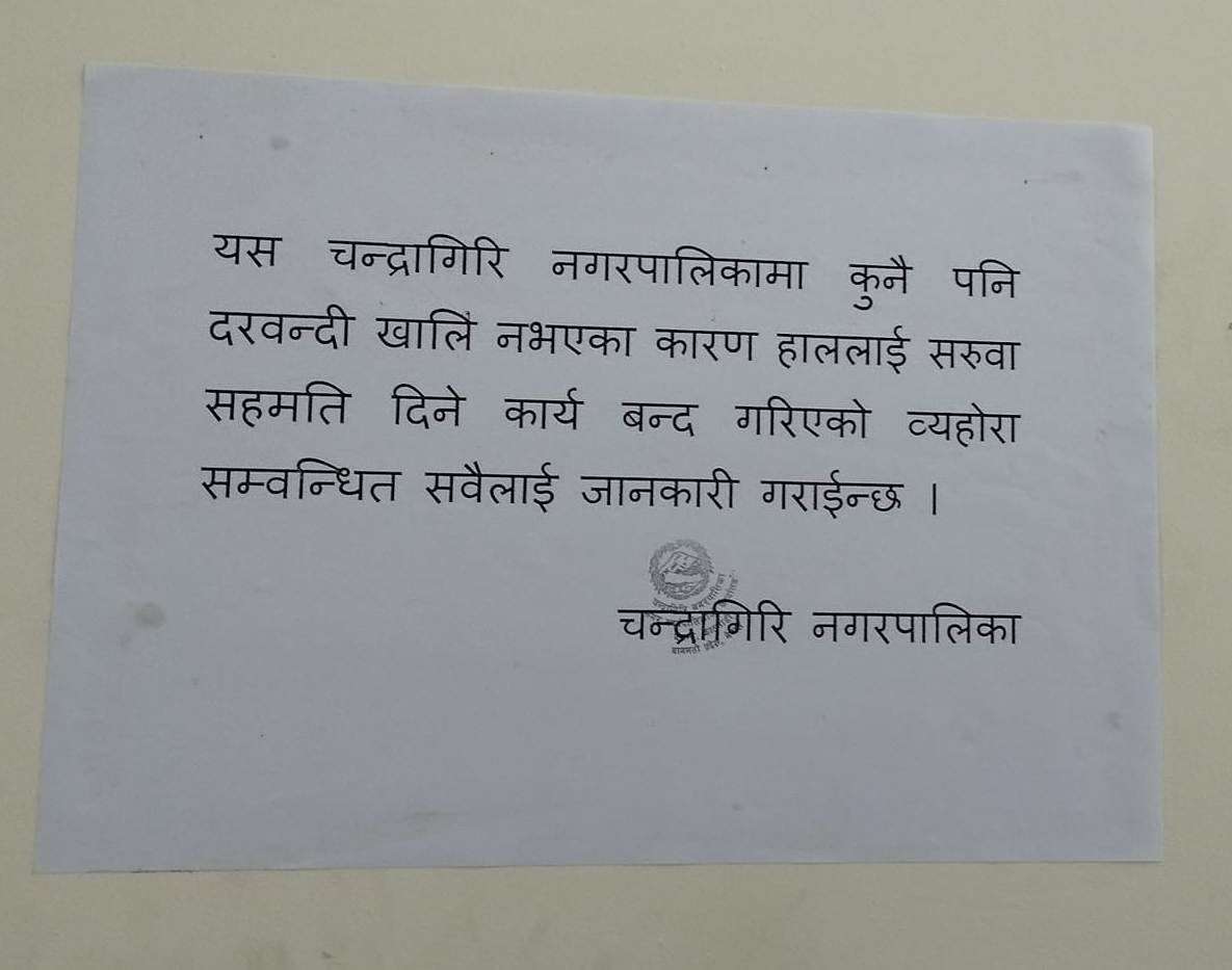 चन्द्रागिरि नगरपालिकामा सरूवाका लागि अत्यधिक माग हुन थालेपछि नगरपालिकाले सूचना नै निकालेर दरबन्दी खाली नरहेको जानकारी दिएको छ ।