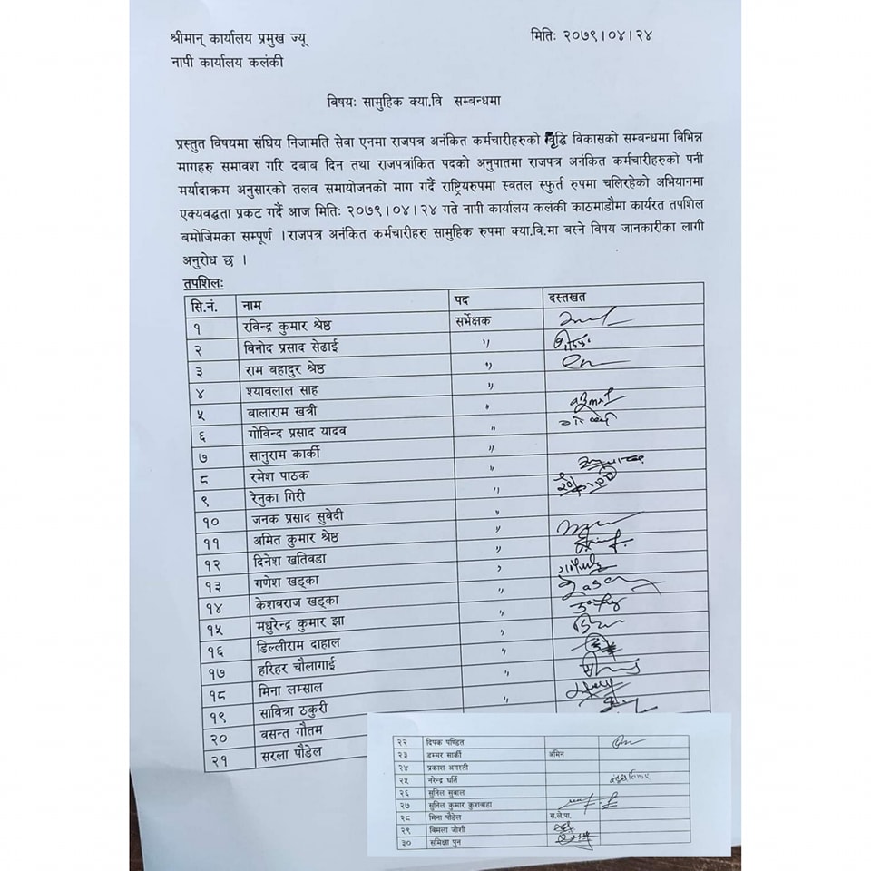 कलङ्कीस्थित नापी कार्यालयका नायब सुब्बासहित राजपत्र अनंकित ३० जना कर्मचारीहरू सामुहिक बिदा बसेका छन् ।