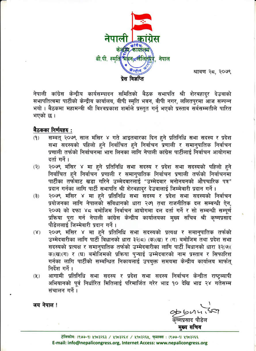 नेपाली कांग्रेसले आगामी मंसिर ४ का लागि तय भएको प्रतिनिधि र प्रदेश सभाको निर्वाचनका लागि उम्मेदवार मनोनयनको औपचारिक पत्र पठाउने जिम्मा सभापति शेरबहादुर देउवालाई दिएको छ ।