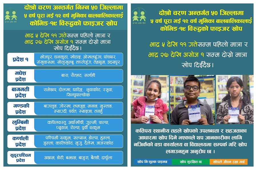 भदौ ५ गतेदेखि भदाै ११ गतेसम्म पहिलो मात्रा र भदौ २७ गतेदेखि असोज १ गतेसम्म दोस्रो मात्रा फाइजर खोप लगाइने स्वास्थ्य तथा जनसङ्ख्या मन्त्रालयले जनाएको छ । ५० जिल्लाका ५ देखि १२ वर्षमुनिका बालबालिकालक्षित खोप अभियान सुरु हुन लागेको हो ।