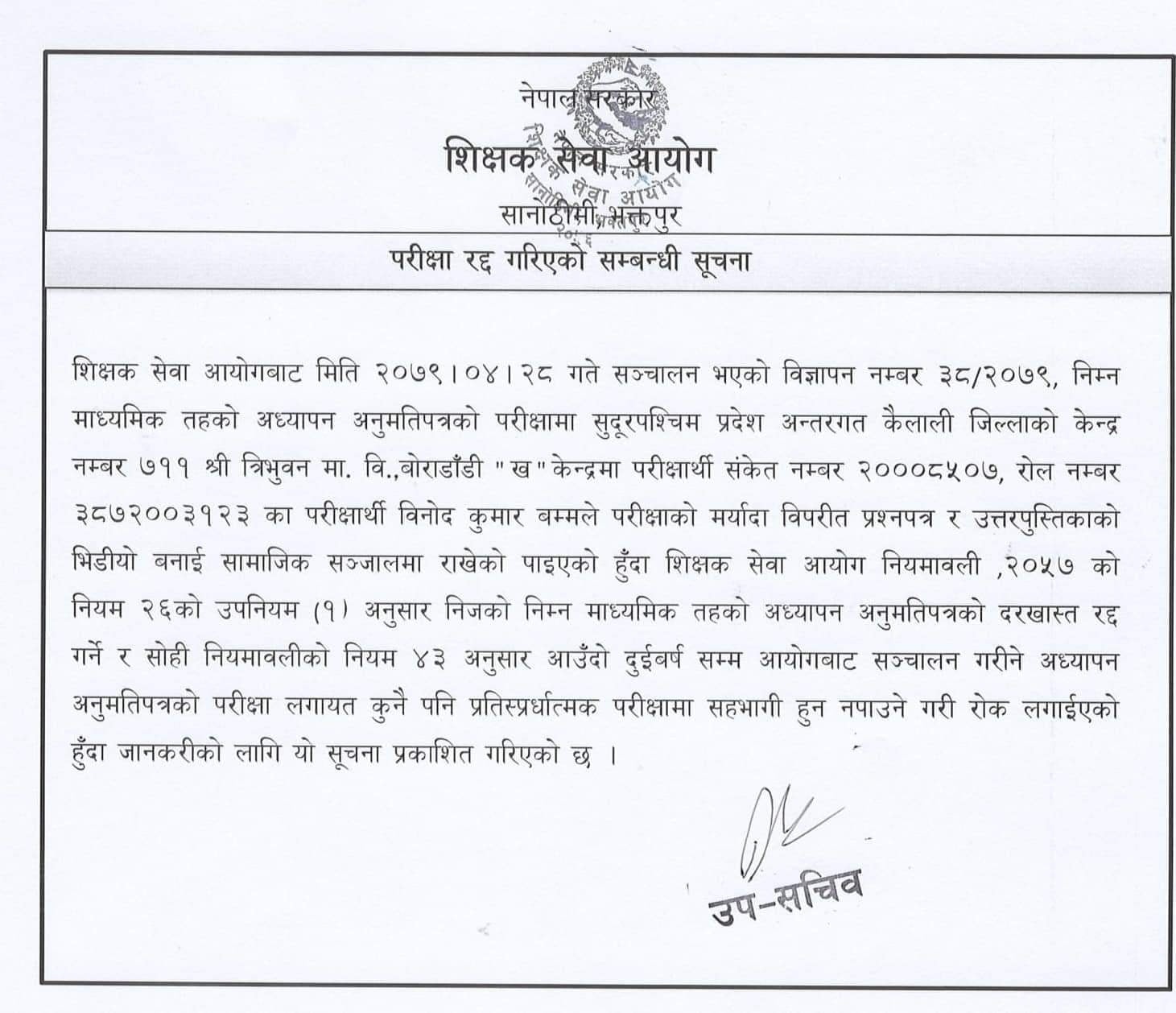 शिक्षक सेवा आयोगबाट यही साउन २८ गते सञ्चालन भएको निम्न माध्यमिक तहको अध्यापन अनुमतिपत्रको परीक्षामा कैलालीको श्री त्रिभुवन माध्यमिक विद्यालयको बोराडाँडी ख केन्द्रका परीक्षार्थी विनोदकुमार बमले परीक्षाको मर्यादा विपरीत प्रश्नपत्र र उत्तरपुस्तिकाको भिडियो बनाएर सामाजिक सञ्जालमा राखेका थिए ।