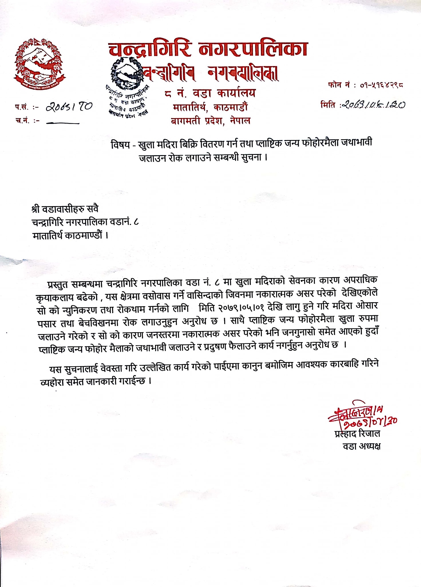 वडा कार्यालयले सोमबार जारी गरेको सूचना अनुसार खुल्ला रूपमा प्लाष्टिकजन्य फोहोरमैला जलाएको गुनासो बढेपछि वडा क्षेत्रमा सो खालको क्रियाकलाप गर्न बर्जित गरिएको हो ।