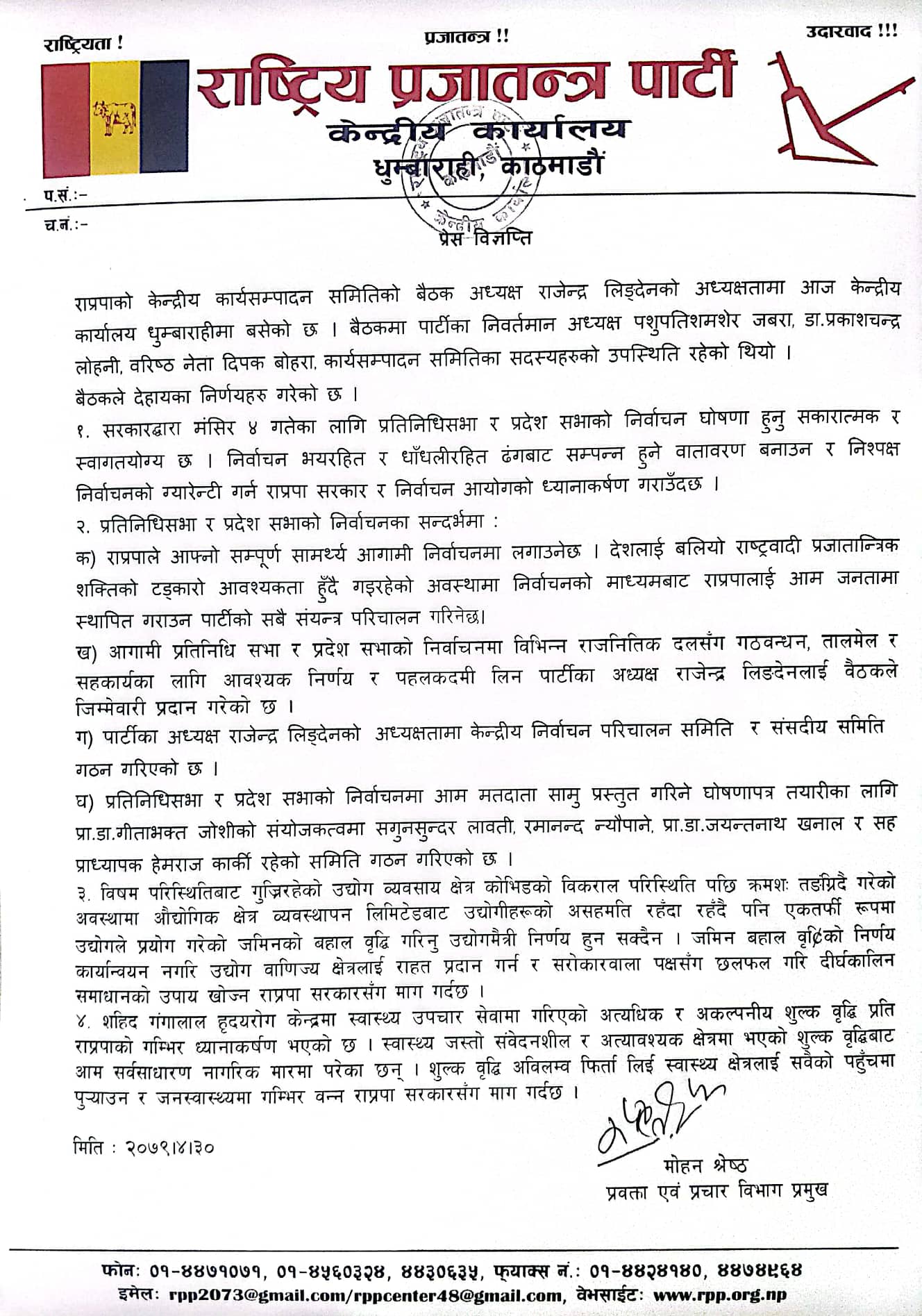 मंसिर ४ गतेका लागि तय भएको प्रतिनिधि र प्रदेश सभा चुनावका लागि चुनावी गठबन्धन, तालमेल र सहकार्यका लागि आवश्यक निर्णय र पहलकदमी गर्न राप्रपाले अध्यक्ष राजेन्द्र लिङ्देनलाई जिम्मेवारी दिएको छ।
