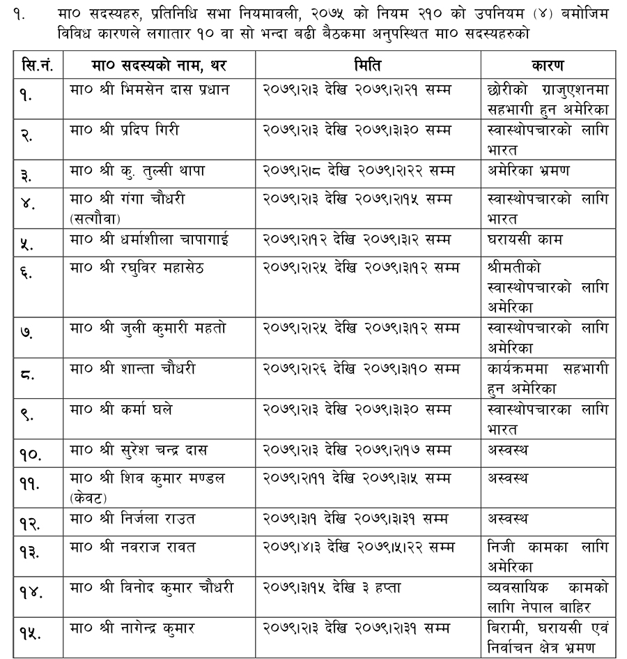 संसदमा सबैभन्दा बढी समय अनुपस्थित हुने १५ जना सांसदहरुको नामावली सार्वजनिक भएको छ ।