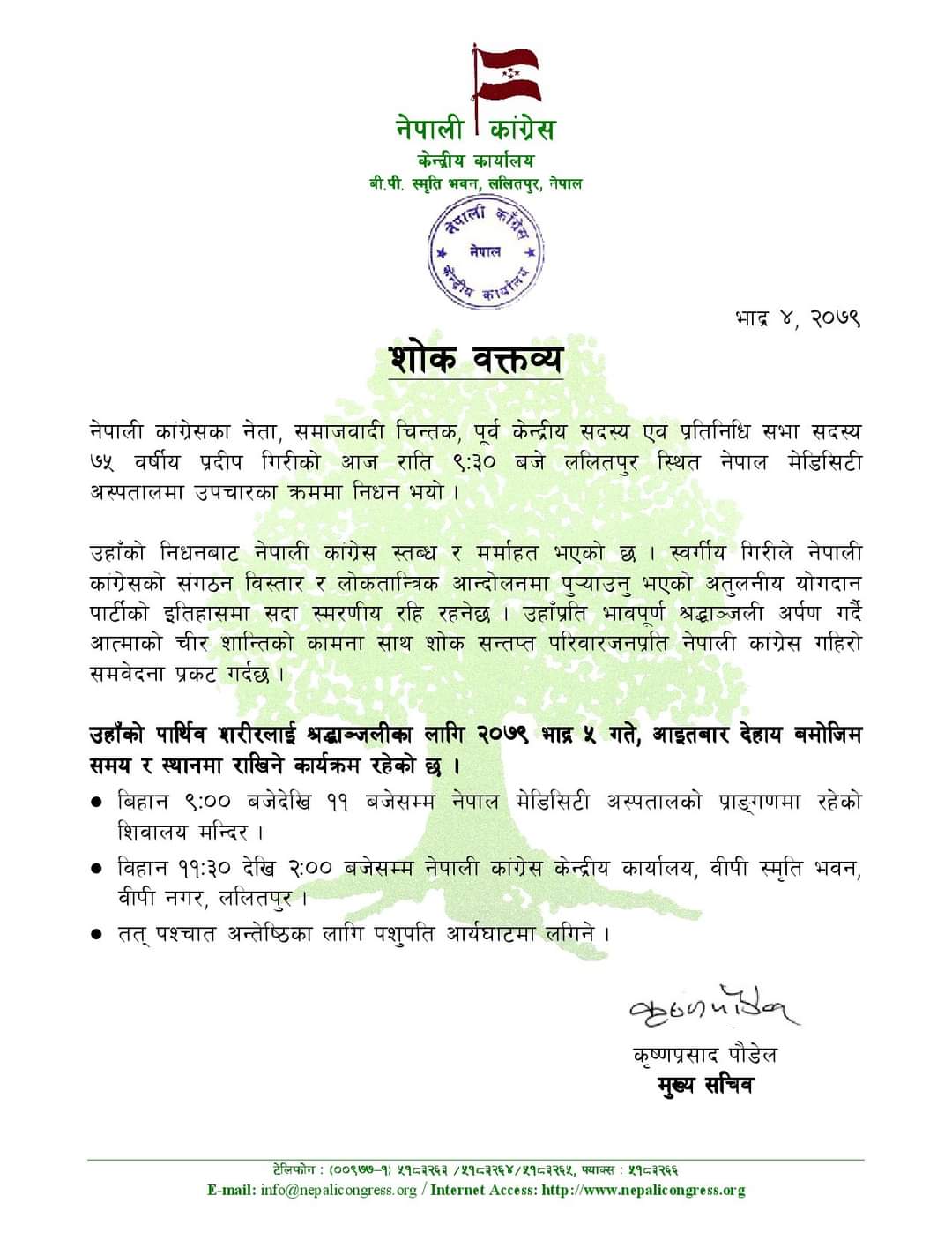 पार्टी कार्यालयमा अन्तिम श्रद्धाञ्जलीपछि गिरीको आजै दिउँसो पशुपतिमा अन्त्येयष्टि गरिने मुख्य सचिव पौडेलले जानकारी दिए ।