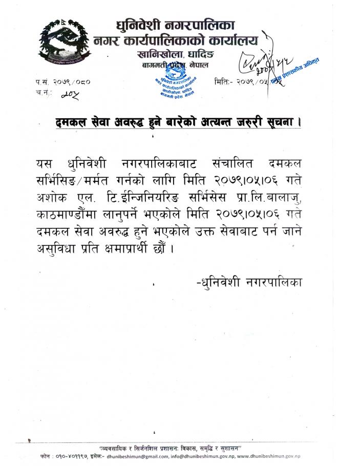 नियमित मर्मतका लागि नगरपालिकाको दमकल काठमाण्डाै ल्याइएपछि सो सेवा अवरूद्ध भएको नगरपालिकाले जनाएको छ ।