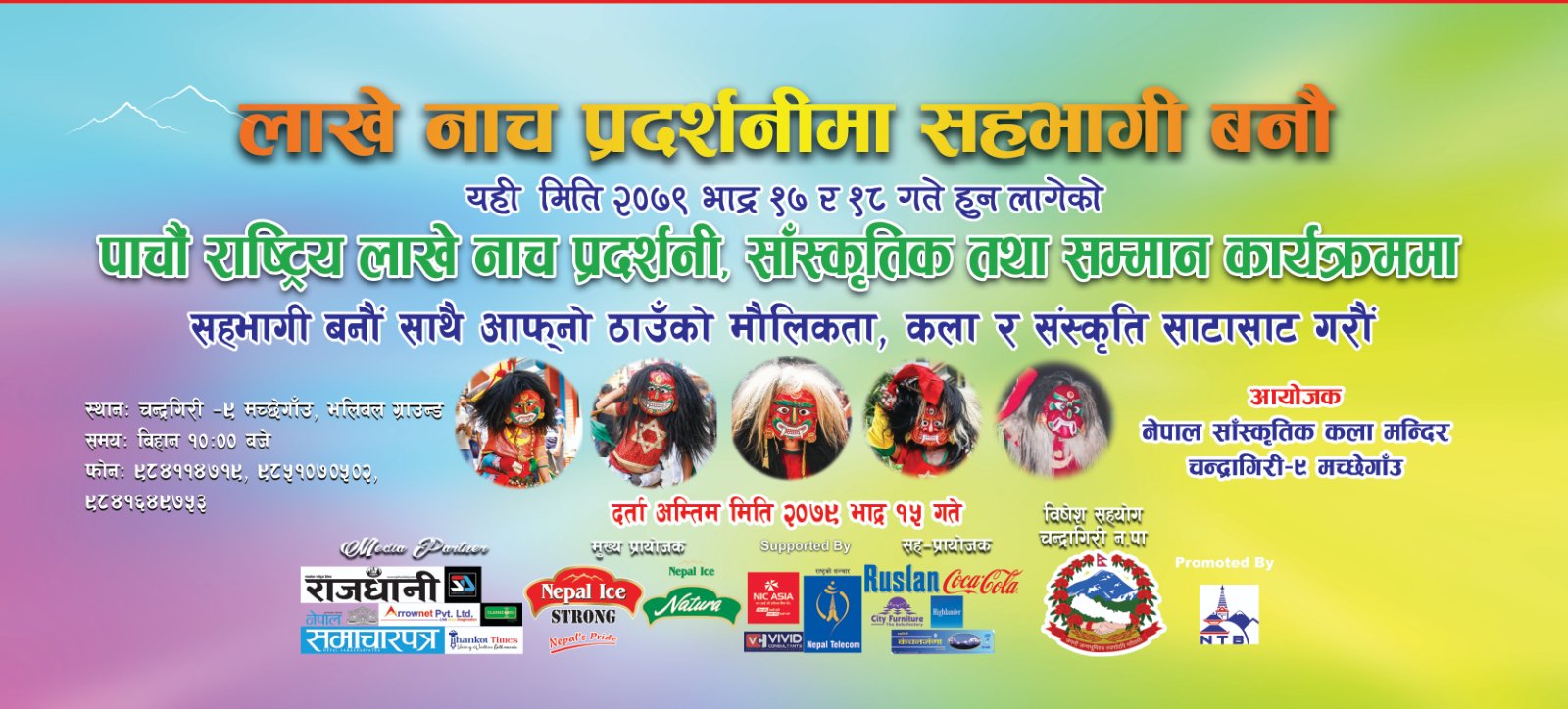 “चिनौ हाम्रो संस्कृति आफ्नो ठाउँको मौलिकता, कला संस्कृति साटासाट गरौं” नाराका साथ यसपटक लाखे प्रदर्शनी कार्यक्रम आयोजना गर्न लागिएको आयोजक संस्थाका अध्यक्ष रमेश शाहीले जानकारी दिनुभयो ।