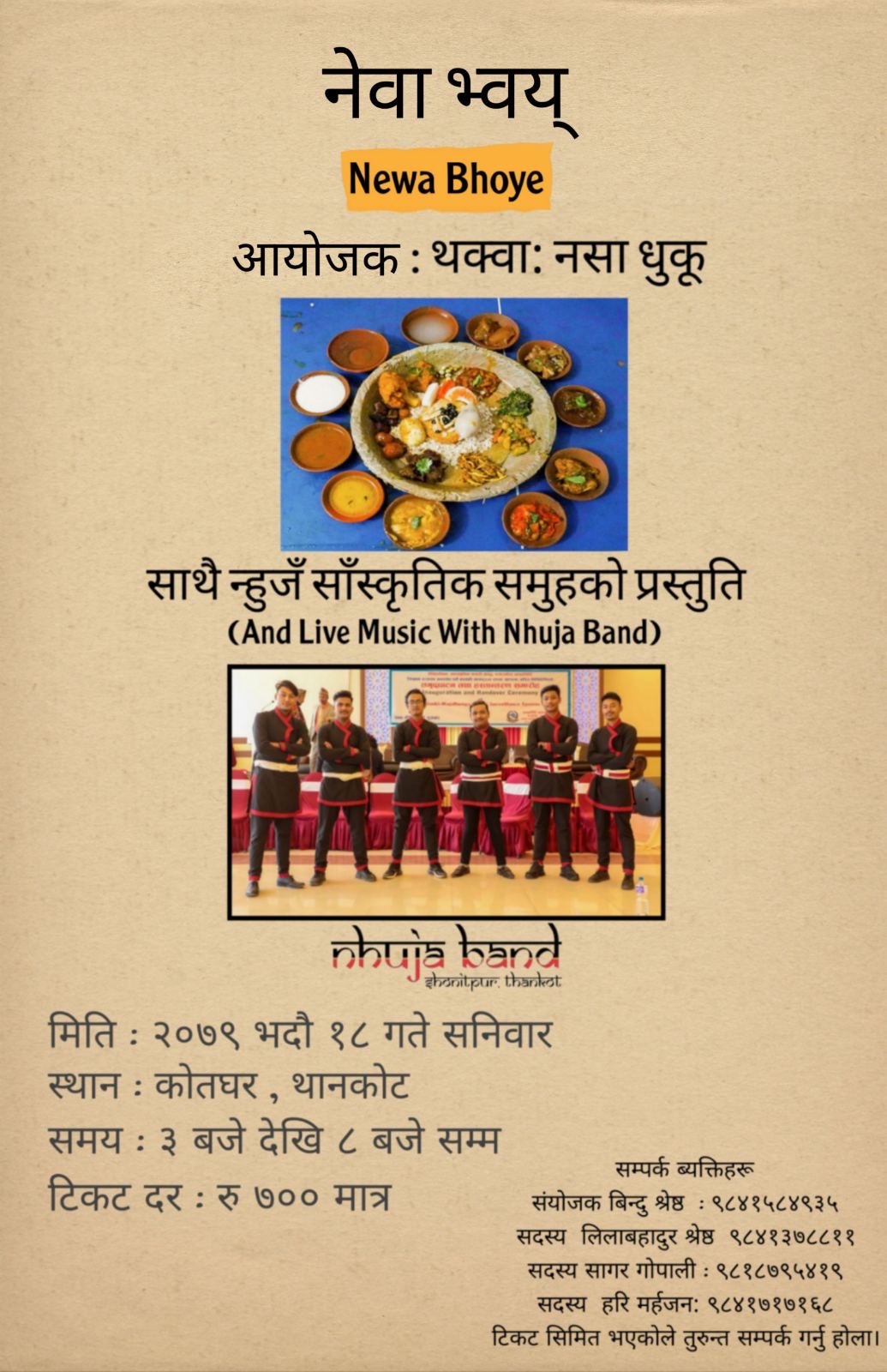 नेवाः भ्वय् २०७९ तथा न्हूँज साँस्कृतिक साँझ नाम दिइएको सो कार्यक्रम भदाै १८ गते शनिबार आयोजना हुनेछ । चन्द्रागिरि नगरपालिका-४ थानकोटस्थित कोतघरमा थक्वाः नसा धुकूको संंयोजनमा इन्द्रजात्राका अवसरमा आयोजना हुने सो कार्यक्रममा न्हूजँ सांगितिक समुहले ‘लाइभ’ प्रस्तुति दिनेछ ।