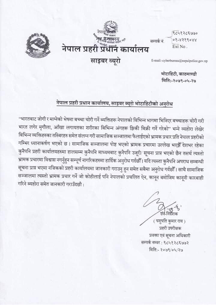 पछिल्लो समय विभिन्न व्यक्तिले सामाजिक सञ्जालमा भारतबाट आएकाहरूले नेपालमा बच्चा चोरी गरिरहेको भन्दै भ्रम फैलाएपछि प्रधान कार्यालय, साइबर ब्यूरो भोटाहिटीले एक सूचना जारी गर्दै त्यस्ता भ्रामक हल्लाको पछि नलाग्न आग्रह गरेको छ ।