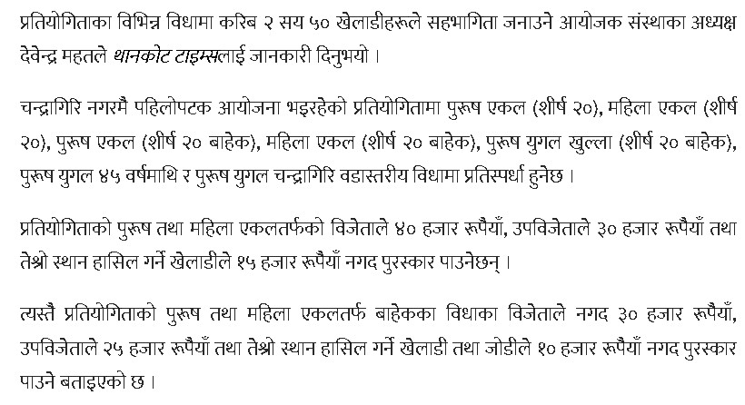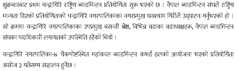 प्रथम चन्द्रागिरि राष्ट्रिय ब्याडमिन्टन प्रतियोगिता सुरू