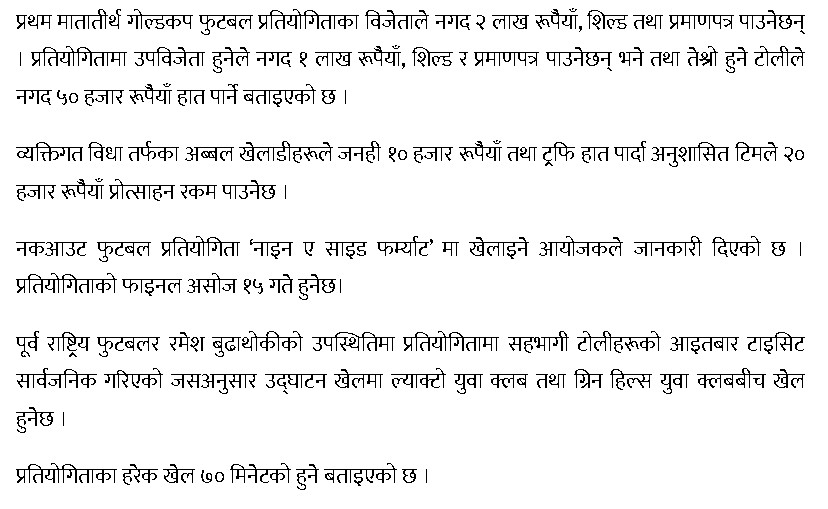प्रथम मातातीर्थ गोल्डकपको तयारी पूरा, २४ टोलीबीच प्रतिस्पर्धा हुने