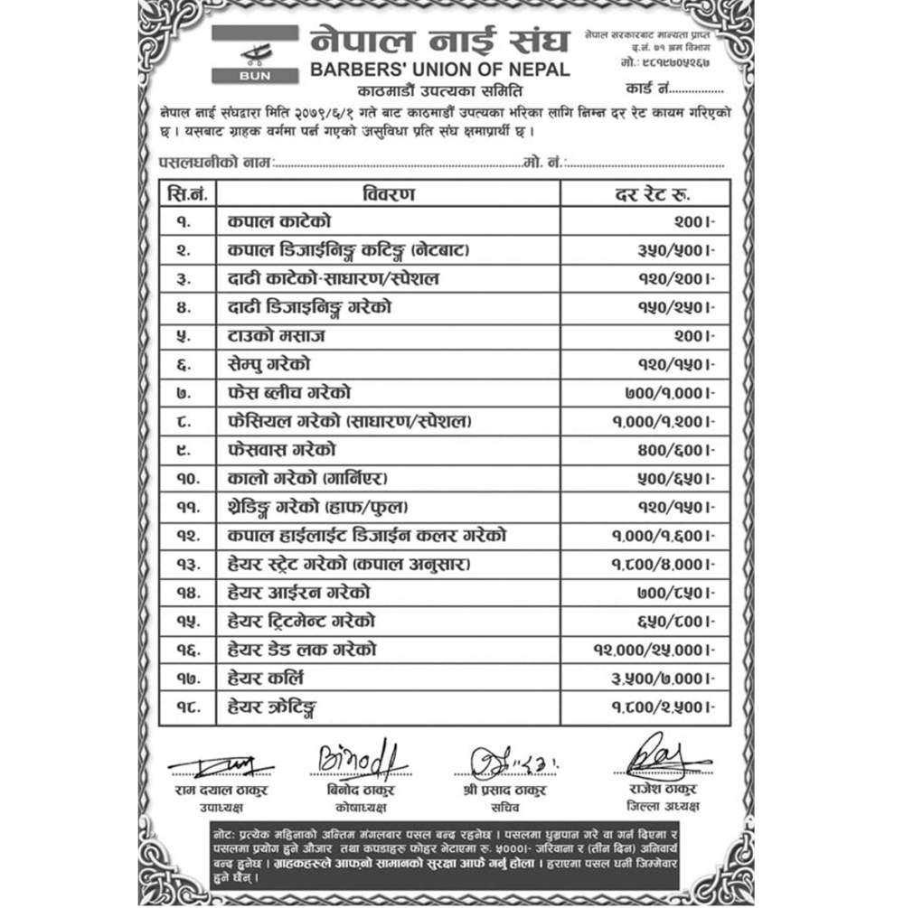 संघले काठमाडौं उपत्यकामा कपाल काट्दा न्यूनतम शुल्क अब २ सय रुपैयाँ तोकेको छ । घरभाडासहित लागत खर्च बढेकाले नेपाल नाई संघ काठमाडौं उपत्यका समितिले असोज १ गतेबाट दाह्री र कपाल काटेको शुल्क बढाएको हो ।