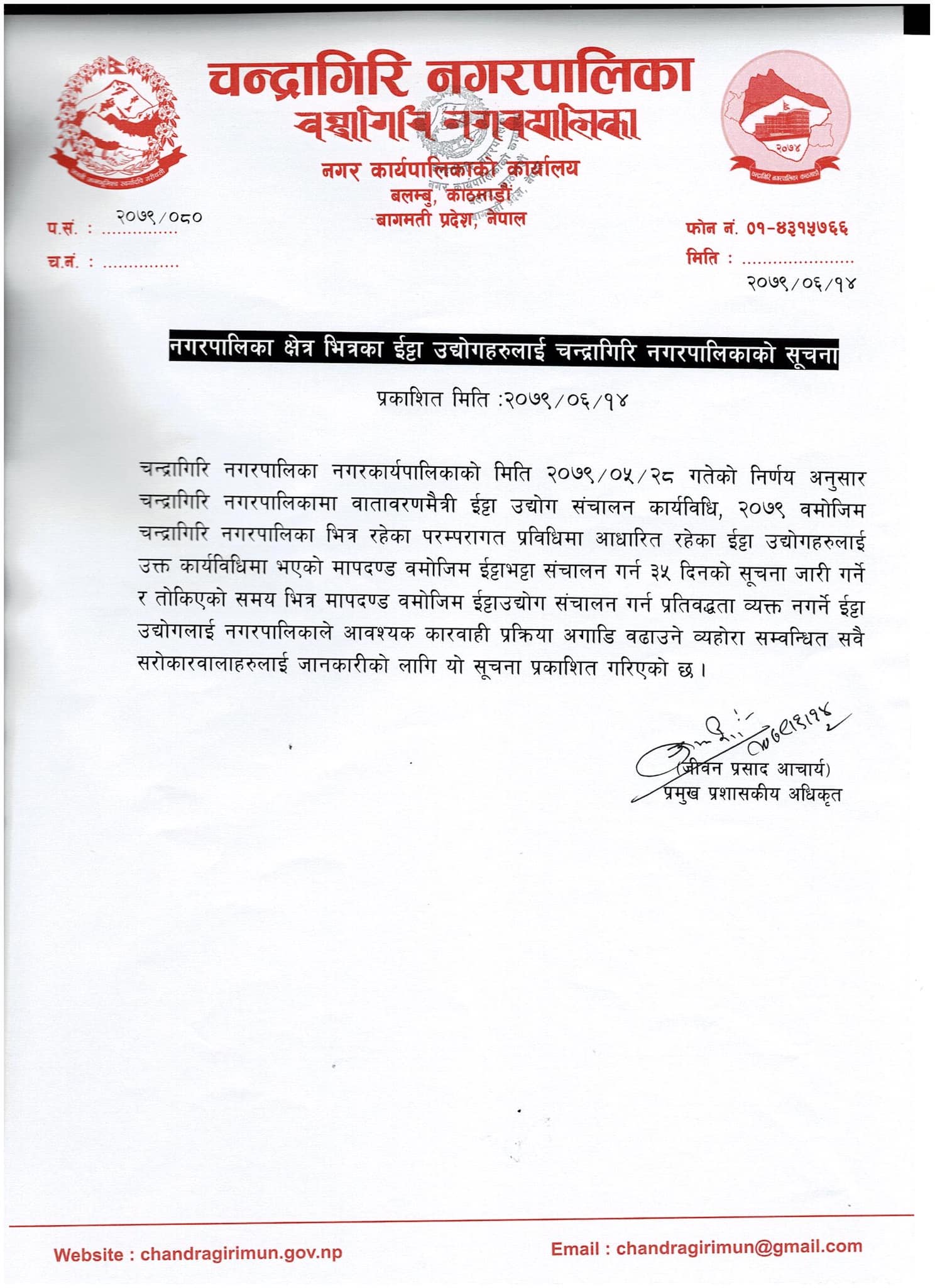शुक्रबार एक सूचना जारी गर्दै नगरपालिकाले नगर कार्यपालिकाको गत भदाै २८ बसेको बैठकको निर्णायानुसार नगरपालिका क्षेत्रमा वातावरणामैत्री ईट्टा उद्योग सञ्चालन कार्यविधि, २०७९ बमोजिम चन्द्रागिरि नगरपालिका क्षेत्र भित्र रहेका परम्परागत प्रविधिमा आधारित रहेका ईट्टा उद्योगहरूलाई उक्त कार्यविधिमा भएको मापदण्ड बमोजिम ईट्टाभट्टा संचालन गर्न ३५ दिनको सूचना जारी गर्ने र तोकिएको समयभित्र मापदण्ड बमोजिम ईट्टा उद्योग संचालन गर्न प्रतिबद्धता व्यक्त नगर्ने ईट्टा उद्योगलाई नगरपालिकाले आवश्यक कारबाही प्रकिया अगाडी बढाउने व्यहोरा जानकारी गराएको छ ।